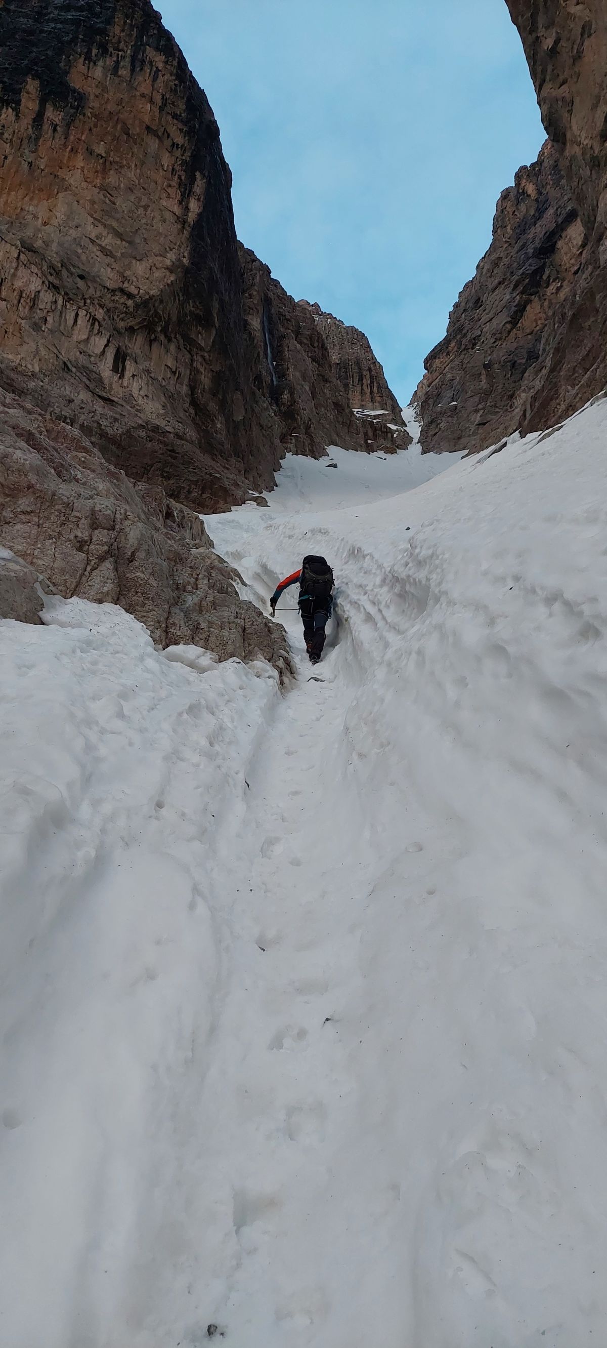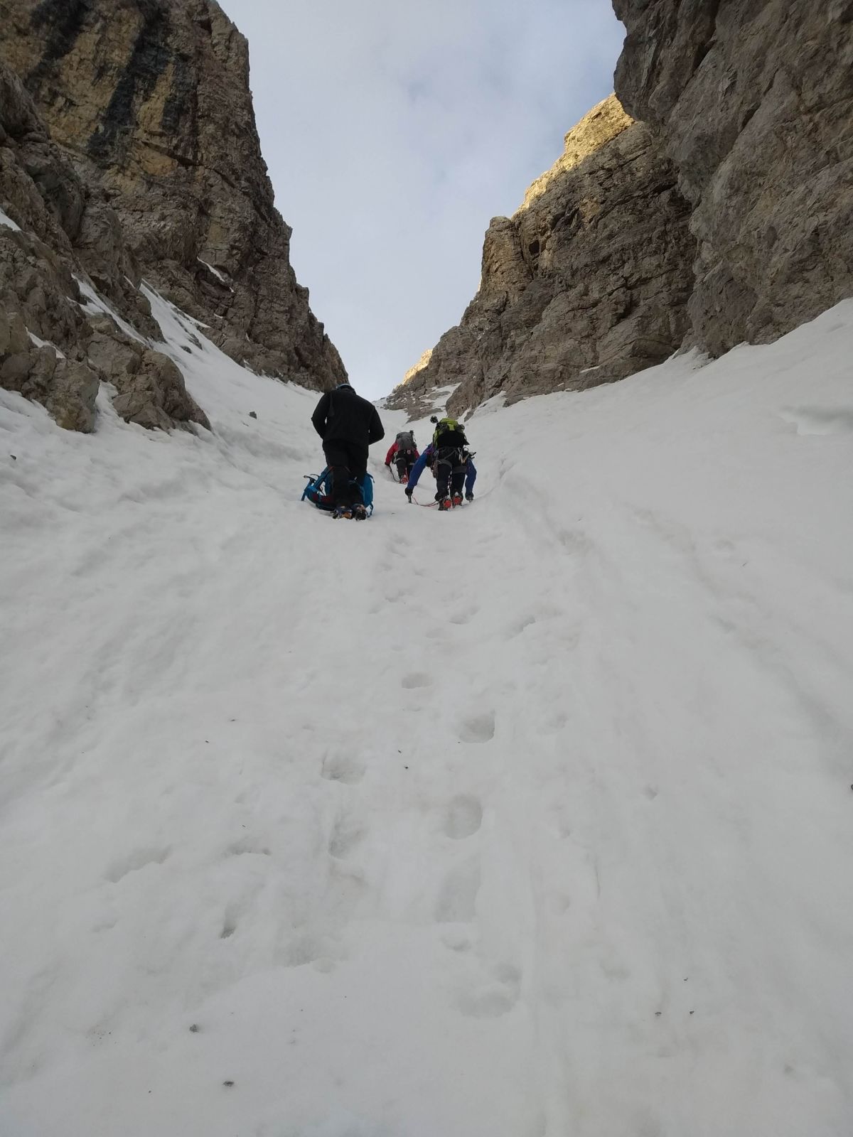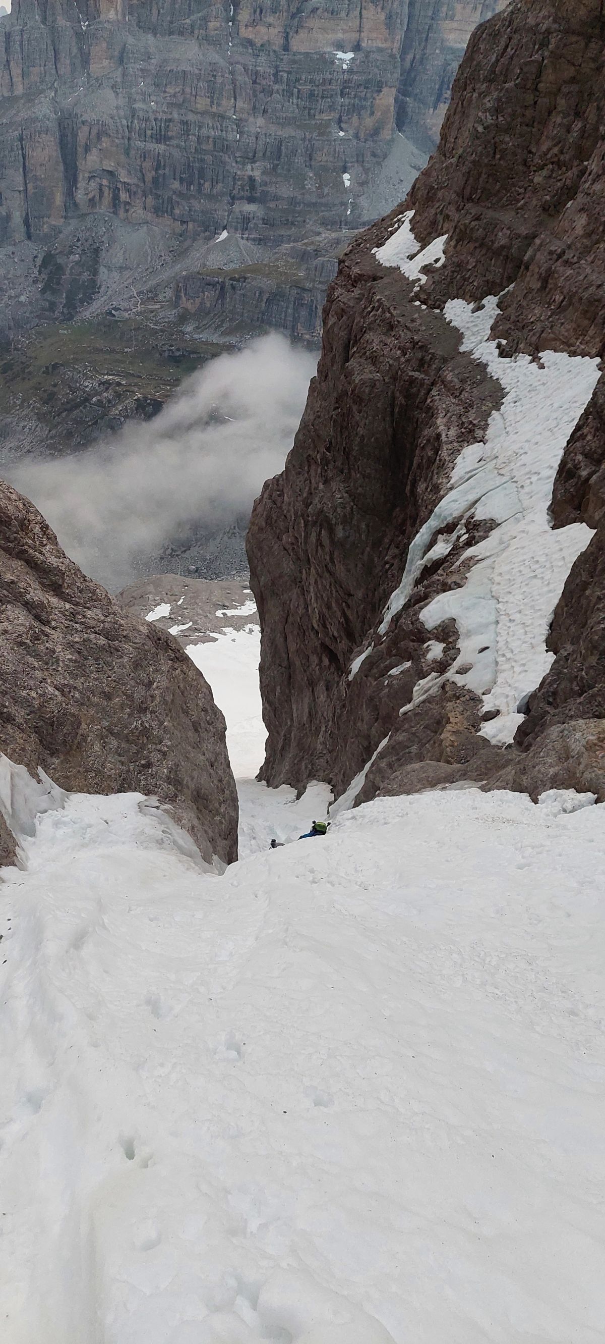 Ascensione di notevole spessore e grande soddisfazione, non difficile tecnicamente, ma comunque molto impegnativa per la ripidità continua del canale (dai 45° in su) e la sua lunghezza. Anche il ritorno è molto lungo e, con la copertura nevosa da noi trovata, va affrontato con molta attenzione soprattutto nella parte alta e una buona esperienza in ambito alpinistico per orientarsi. Non serve ricordare la bellezza e l'unicità che solo le dolomiti di Brenta sanno regalare in ogni scorcio su cui si rivolge lo sguardo.