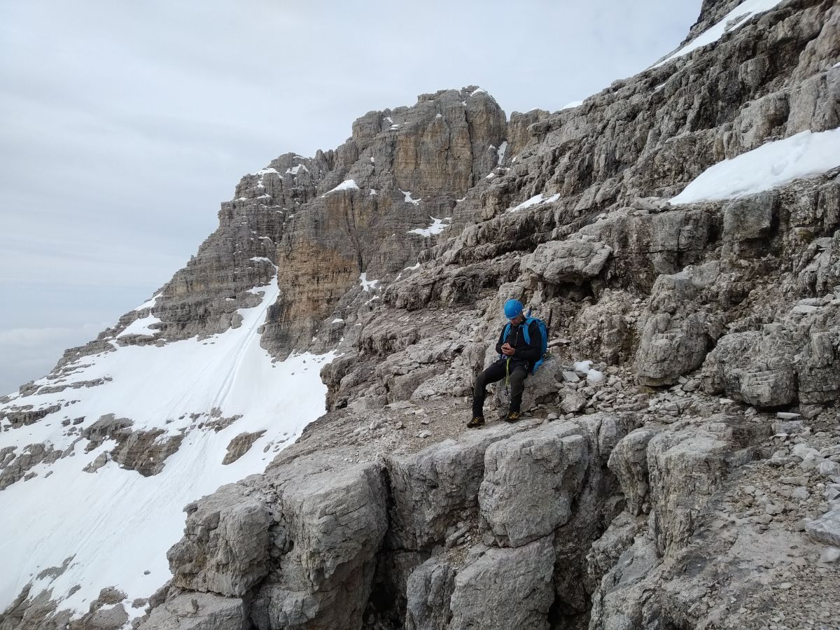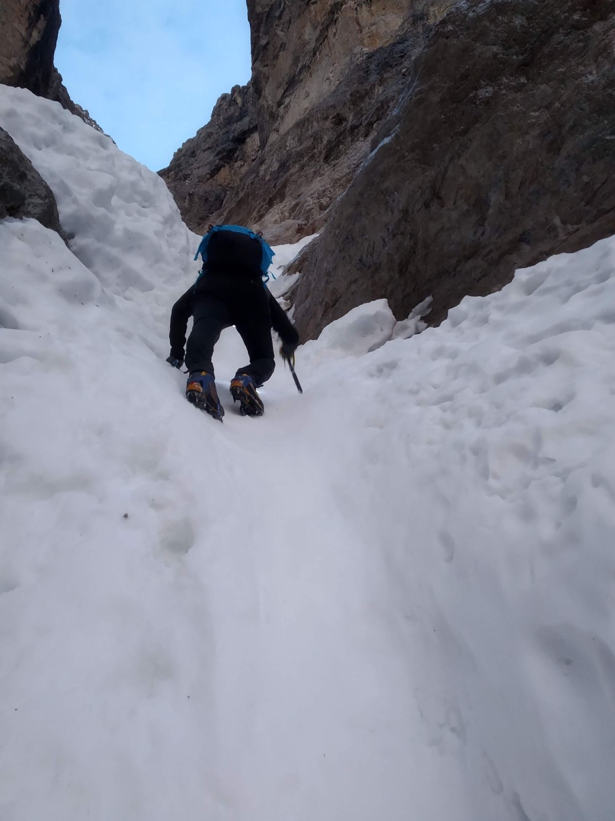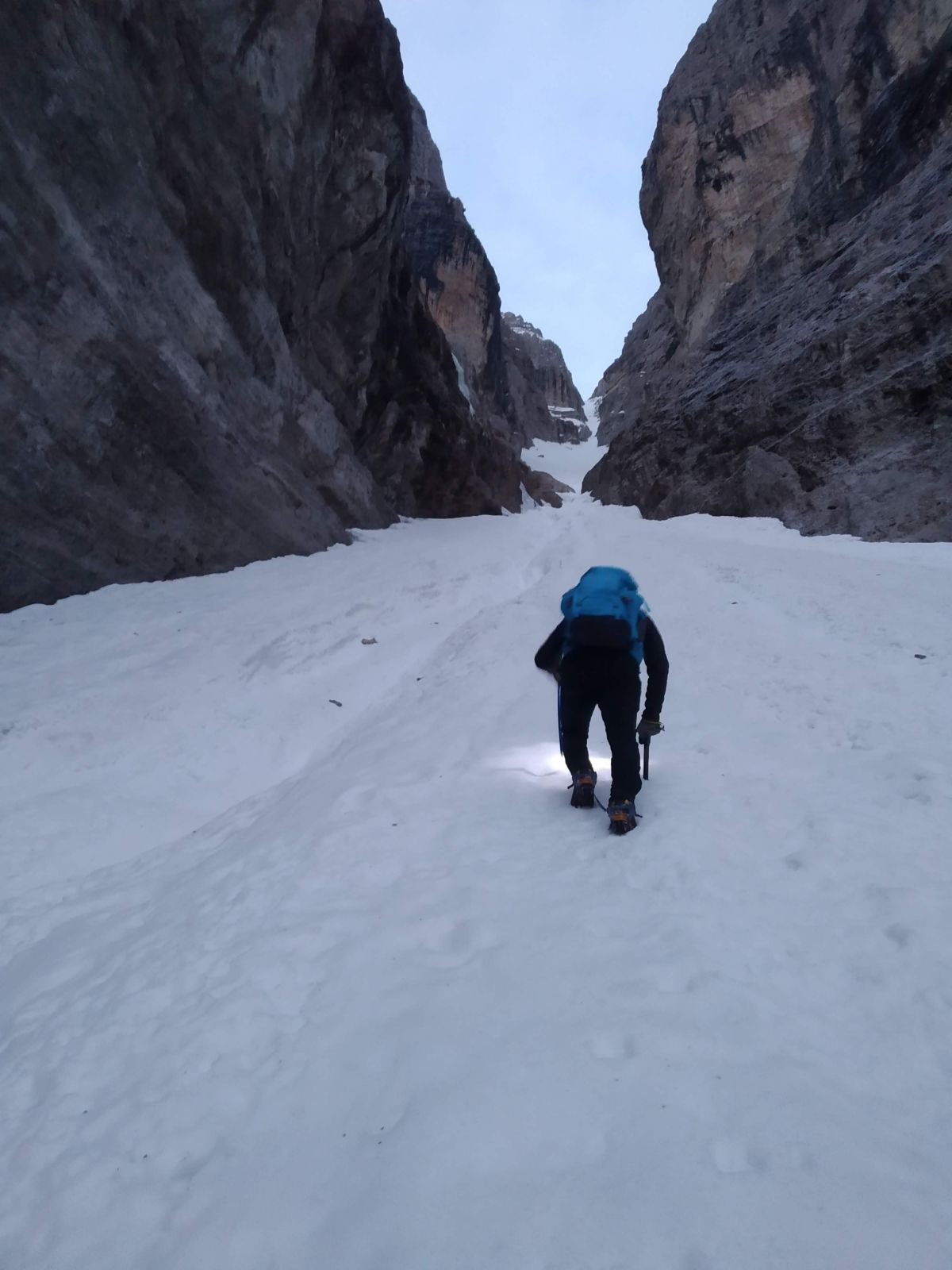 Ascensione di notevole spessore e grande soddisfazione, non difficile tecnicamente, ma comunque molto impegnativa per la ripidità continua del canale (dai 45° in su) e la sua lunghezza. Anche il ritorno è molto lungo e, con la copertura nevosa da noi trovata, va affrontato con molta attenzione soprattutto nella parte alta e una buona esperienza in ambito alpinistico per orientarsi. Non serve ricordare la bellezza e l'unicità che solo le dolomiti di Brenta sanno regalare in ogni scorcio su cui si rivolge lo sguardo.