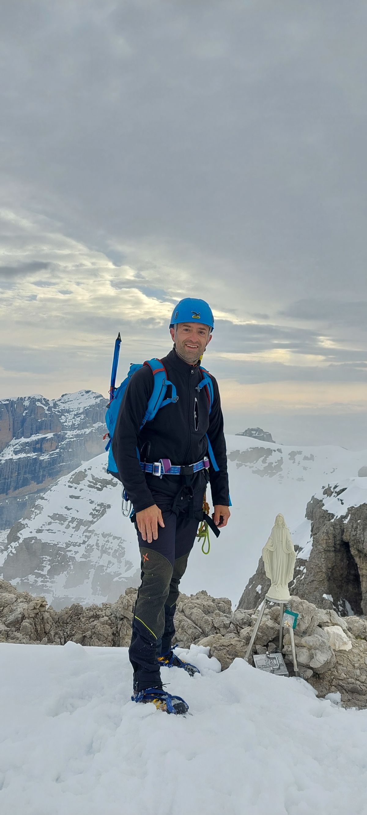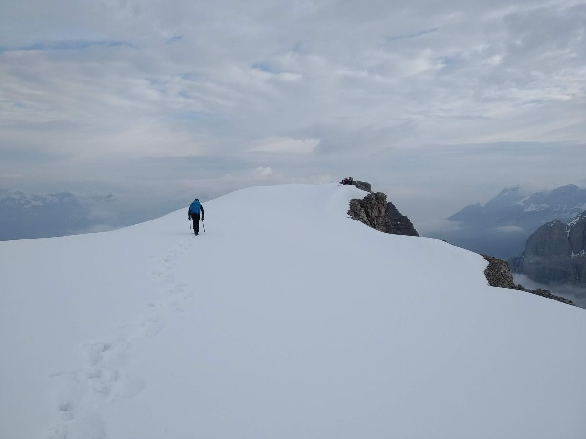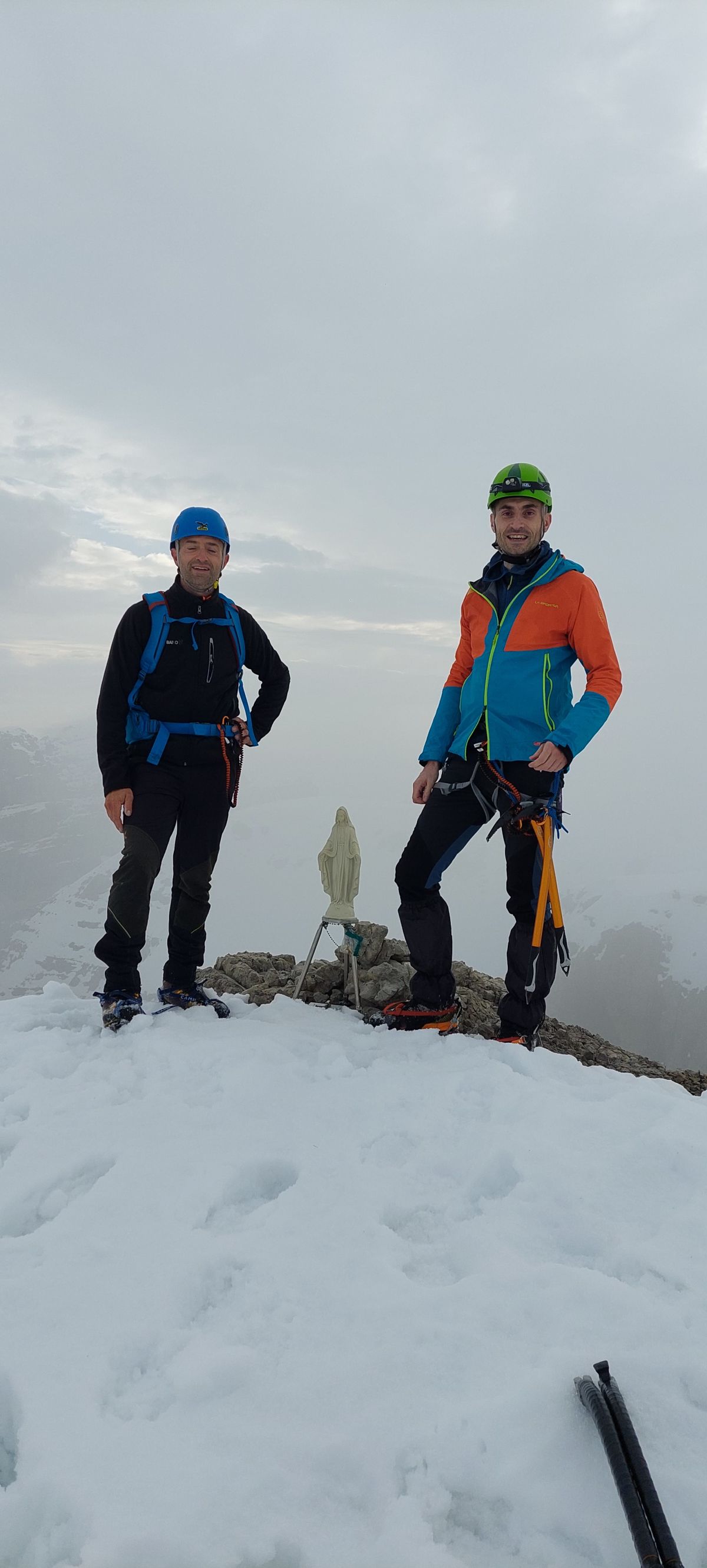 Appena fuori dal canale, girando a destra, raggiungiamo la madonnina di vetta (3136mt), attraversando un incantevole cupolone coperto di neve fresca.