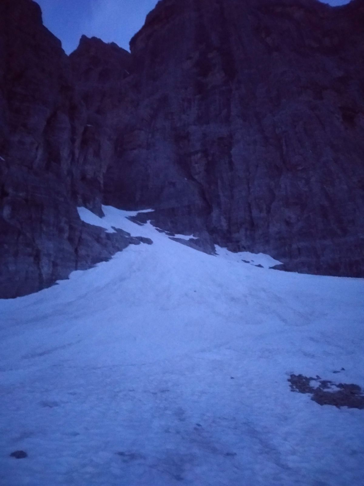 L’inizio del canale è molto largo e con pendenza ridotta; man mano che si sale, il canale diventa sempre più stretto e ripido, fino a raggiungere in alcuni punti i 50-55° di pendenza.