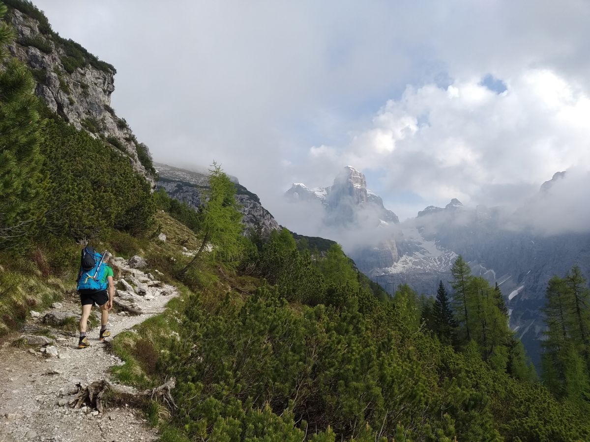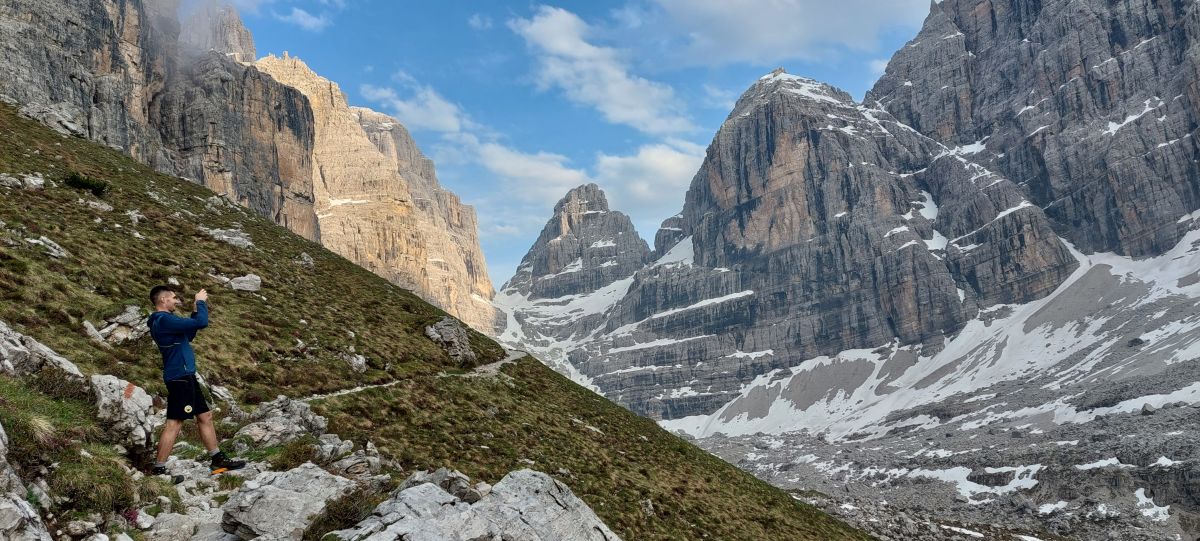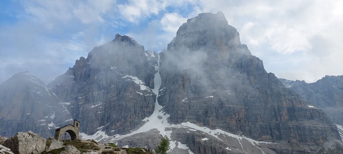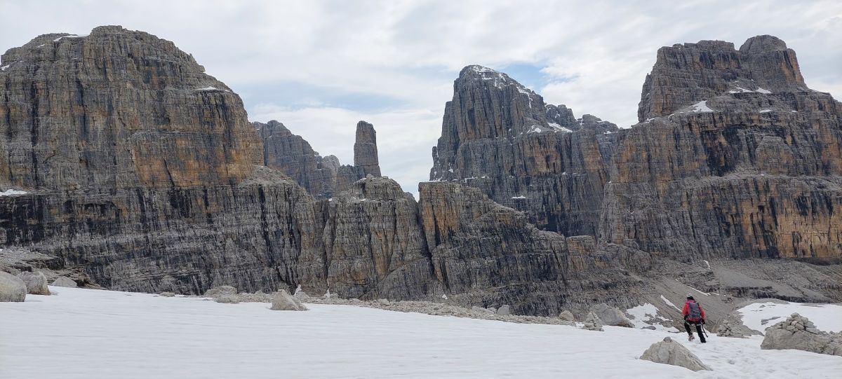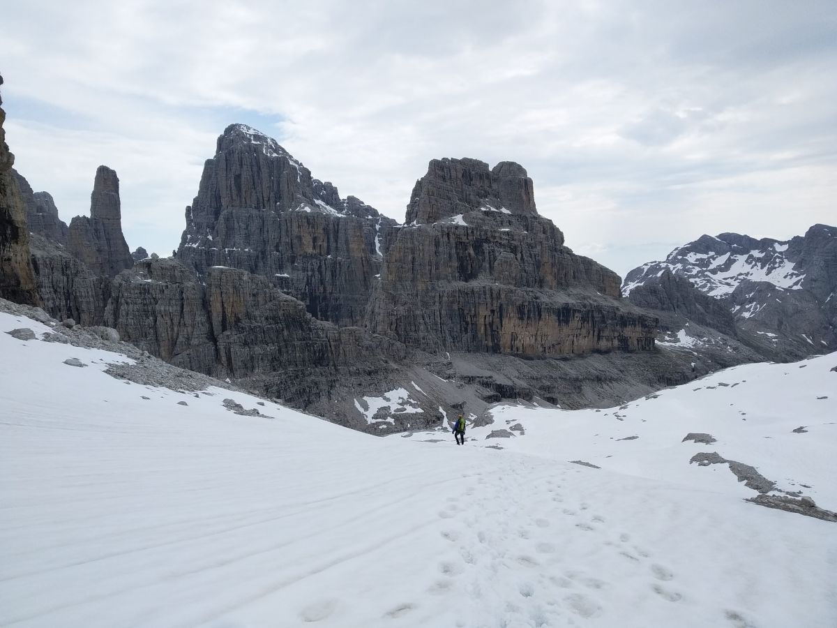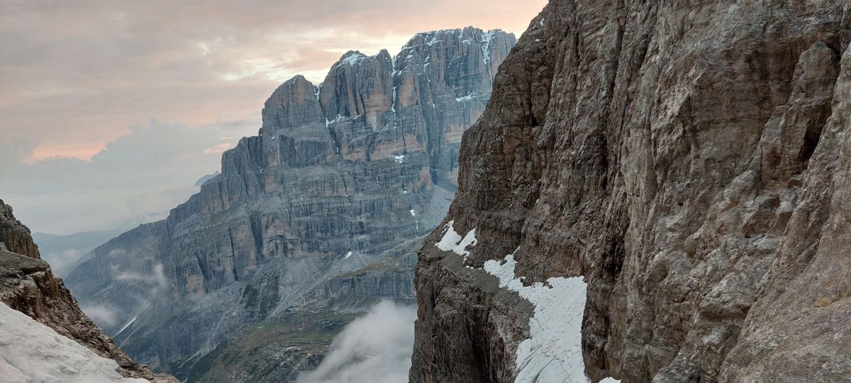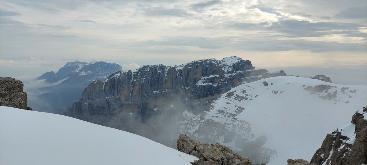 Sono le 7 di mattina, il cielo è attraversato da nuvoloni che ad intermittenza ci tolgono e ci regalano un incantevole vista sulle numerose torri del Gruppo di Brenta, e sui vicini gruppi dell’Adamello-Presanella e dell’Ortles-Cevedale.