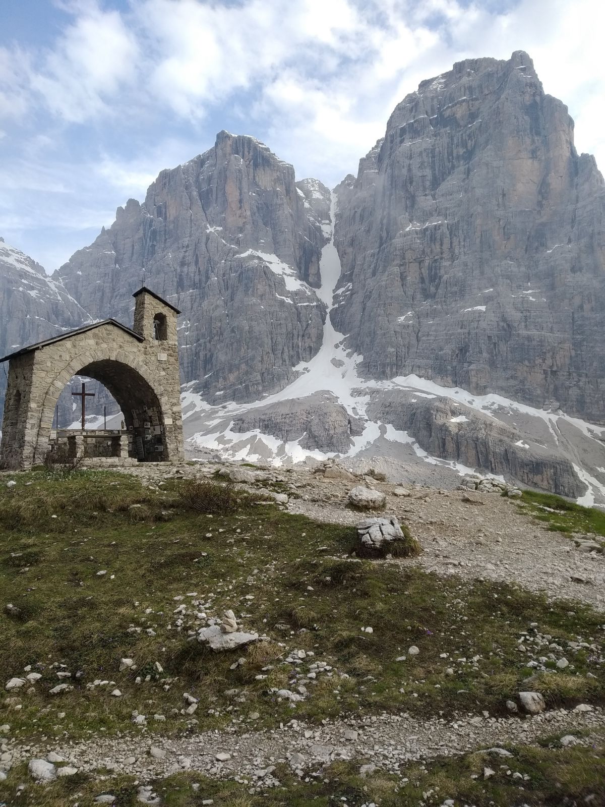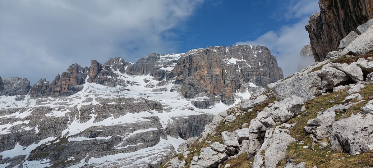 La vista si apre di nuovo sul versante occidentale del Gruppo di Brenta. Proseguendo verso il Brentei dobbiamo ora risalire velocemente attraverso la Bocca di Brenta e, una volta svalicata, rivediamo finalmente la vallata che ci conduce, prima su una ripida traccia ancora sepolta dalla neve, e poi con un più dolce sentiero a mezzacosta, al Rifugio Brentei, (1.15h dal Pedrotti).