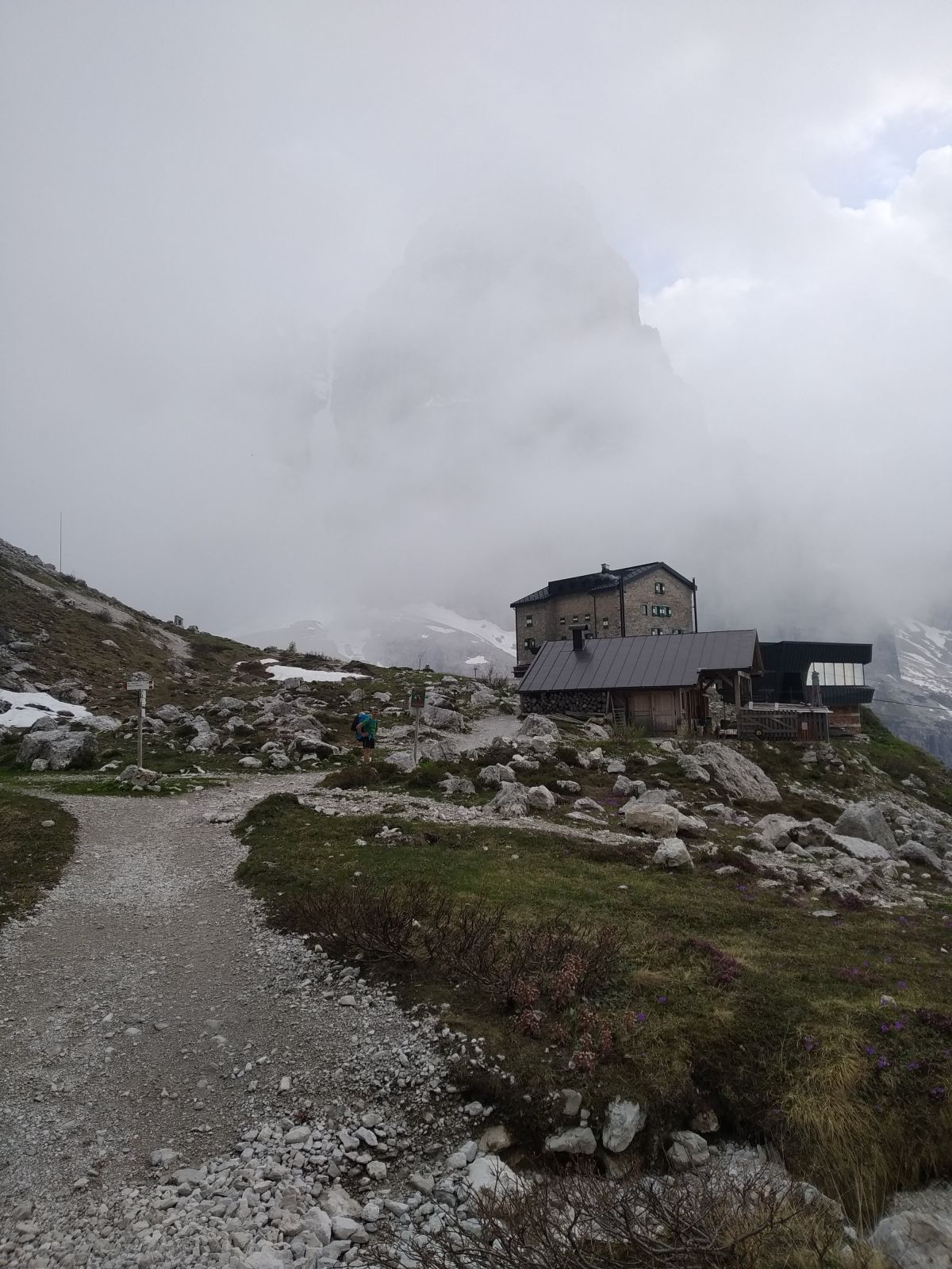 Di nuovo proseguiamo sulla neve nella parte bassa del vallone su traccia in lieve pendenza, per poi camminare in piano sul versante sinistro della montagna, fino a raggiungere il Rifugio Pedrotti (2491mt, 3.30h dalla cima).