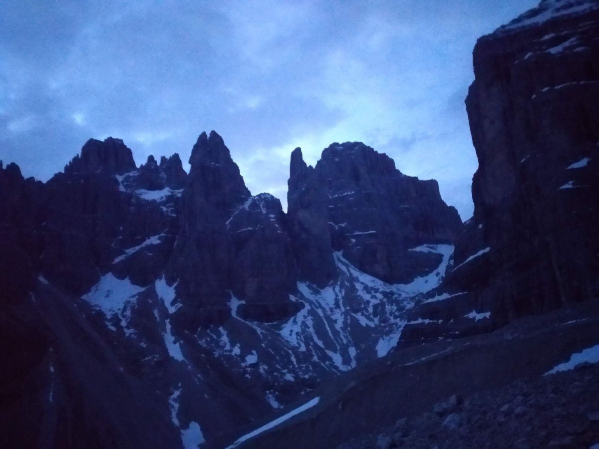 Finalmente organizziamo l’ascensione: raggiungiamo a metà pomeriggio il parcheggio di Vallesinella (1513mt), sopra Madonna di Campiglio. Subito ci incamminiamo nel bosco in direzione del Rifugio Brentei. Il sentiero, salendo veloce nel bosco, supera dopo circa 0.40h il Rifugio Casinei. Quindi proseguendo con un piacevole saliscendi costeggia il versante che ci porta al vallone dove è situato il Rifugio Brentei (2182mt). Dormiamo nello spettacolare bivacco invernale, appena ricostruito in modo veramente confortevole.
