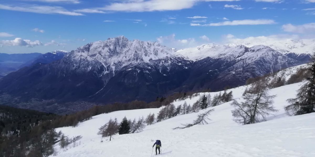 Noi dovremmo passare dal Monte Colombè ma, per la presenza di neve, a un bivio non svoltiamo a sinistra e risaliamo faticosamente un prato per una sorta di via diretta fino alla cima. Il cielo limpidissimo ci fa godere il paesaggio mozzafiato sulla valle Camonica e sul gruppo dell'Adamello (Pizzo Badile, Concarena, Re di Castello, ecc...).