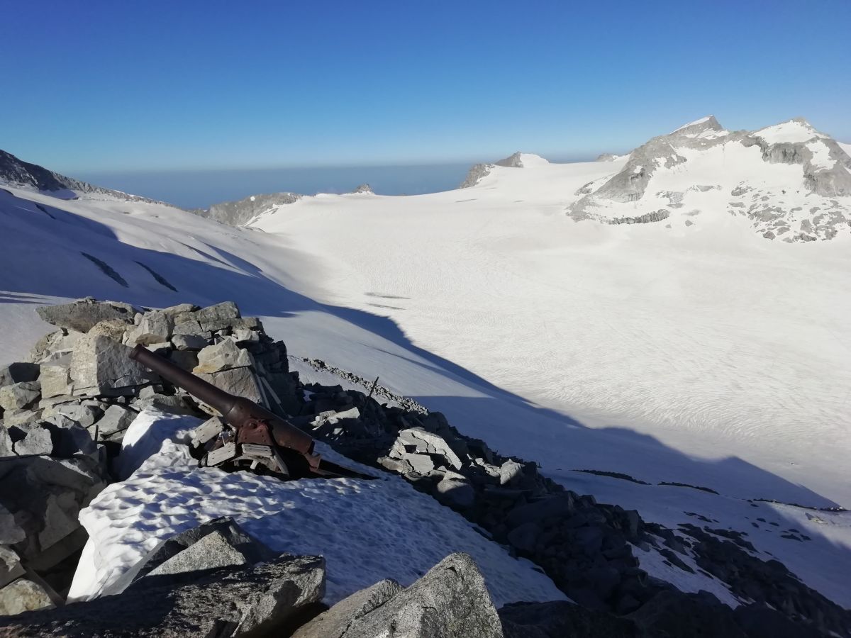Dopo la pausa di rito in vetta, proseguiamo verso sud sulla cresta, prevalentemente su roccia, in alcuni tratti attrezzata con pioli, fino a raggiungere il l’ippopotamo: un cannone 149/G di 60 quintali portato in cima dalle nostre truppe alpine nella prima guerra mondiale.
