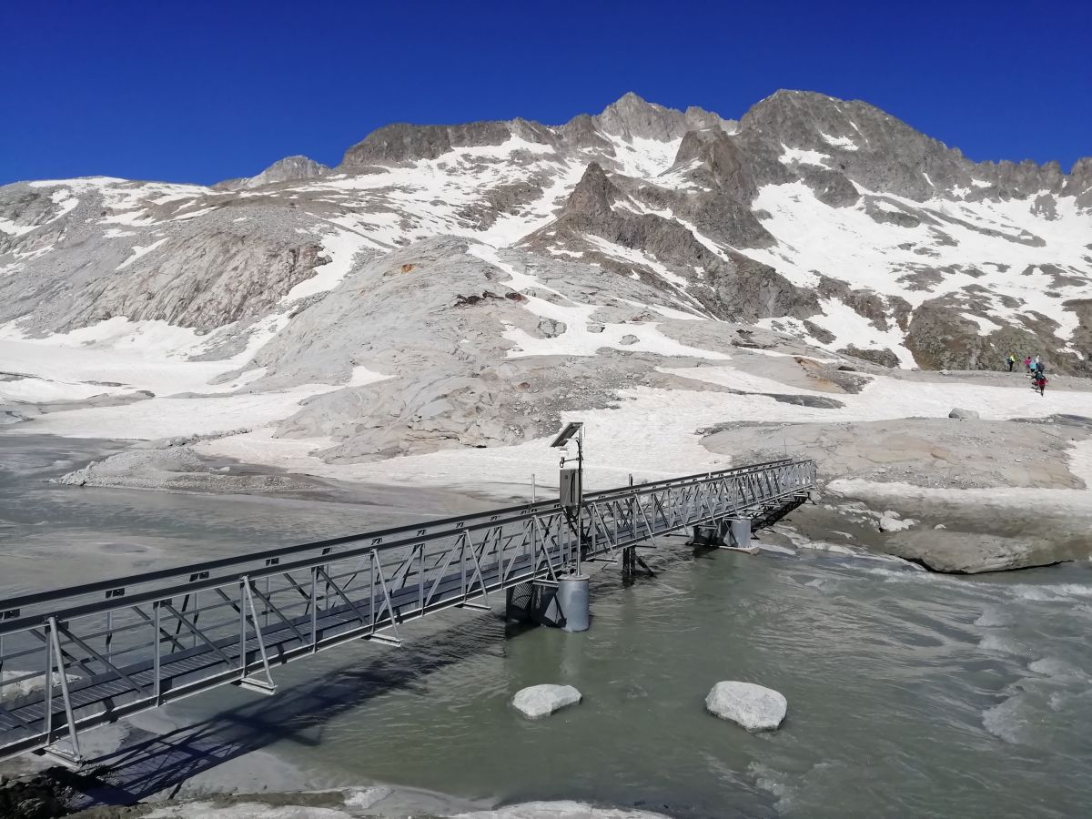 Proseguiamo quindi a destra del rifugio, con sentiero abbastanza pianeggiante, fino a raggiungere la base del ghiacciaio del Mandrone. Attraversato l'imponente "ruscello", che ha origine dallo scioglimento del ghiacciaio, con un ponte di ferro, iniziamo a risalire il ghiacciaio sul lato sinistro, fino a raggiungere la sella che porta al Passo della Lobbia. Ora è visibile il rifugio Caduti dell'Adamello, 3040 mt., nostra destinazione del primo giorno, che raggiungiamo dopo aver risalito la sella.