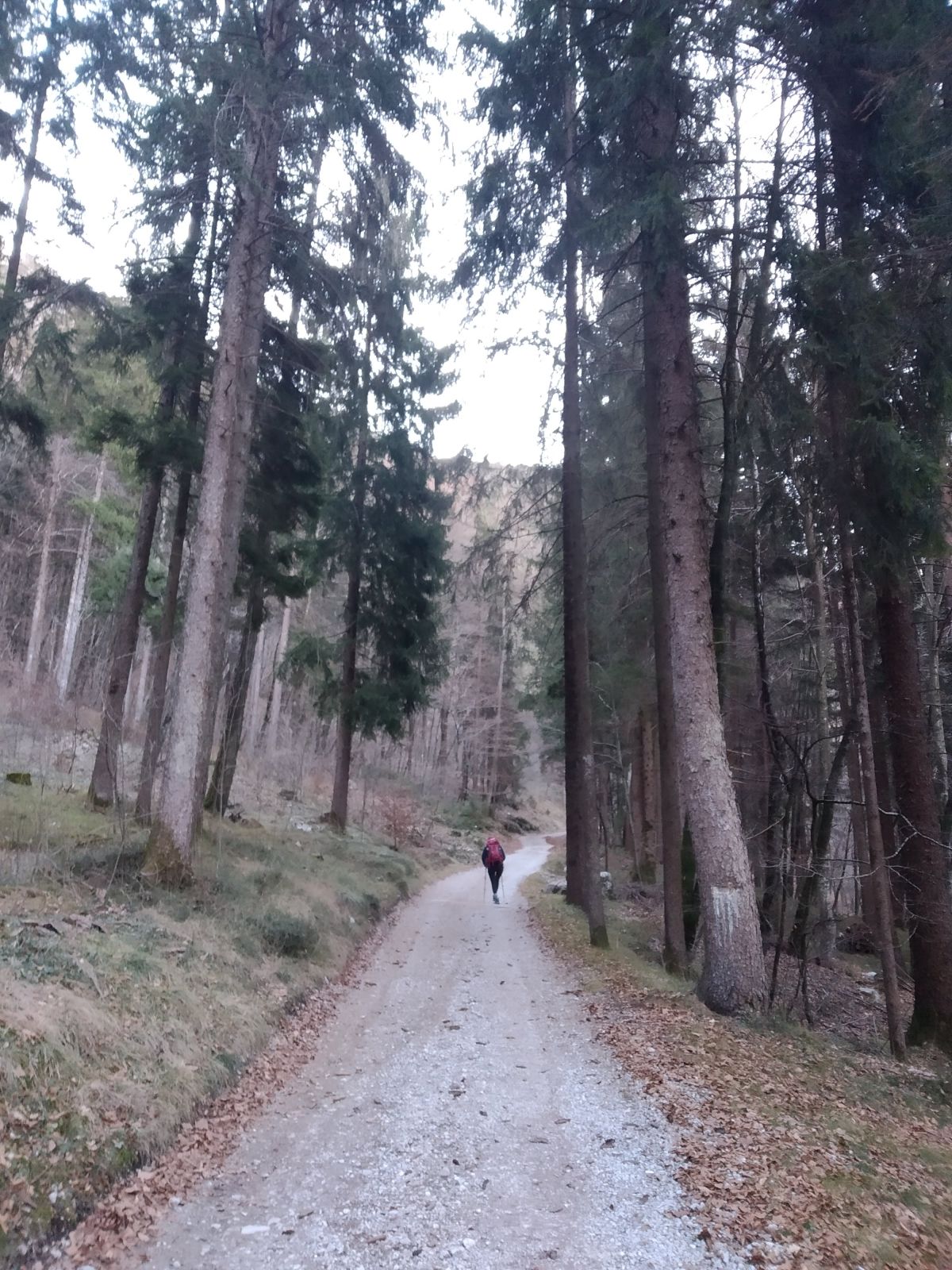 Per la discesa percorriamo a ritroso il percorso della salita fino all'incrocio con il sentiero austroungarico (1425m), dove stavolta, invece che svoltare a sinistra, continuiamo a scendere fino a raggiungere una sterrata (la stessa attraversata più volte durante la salita).