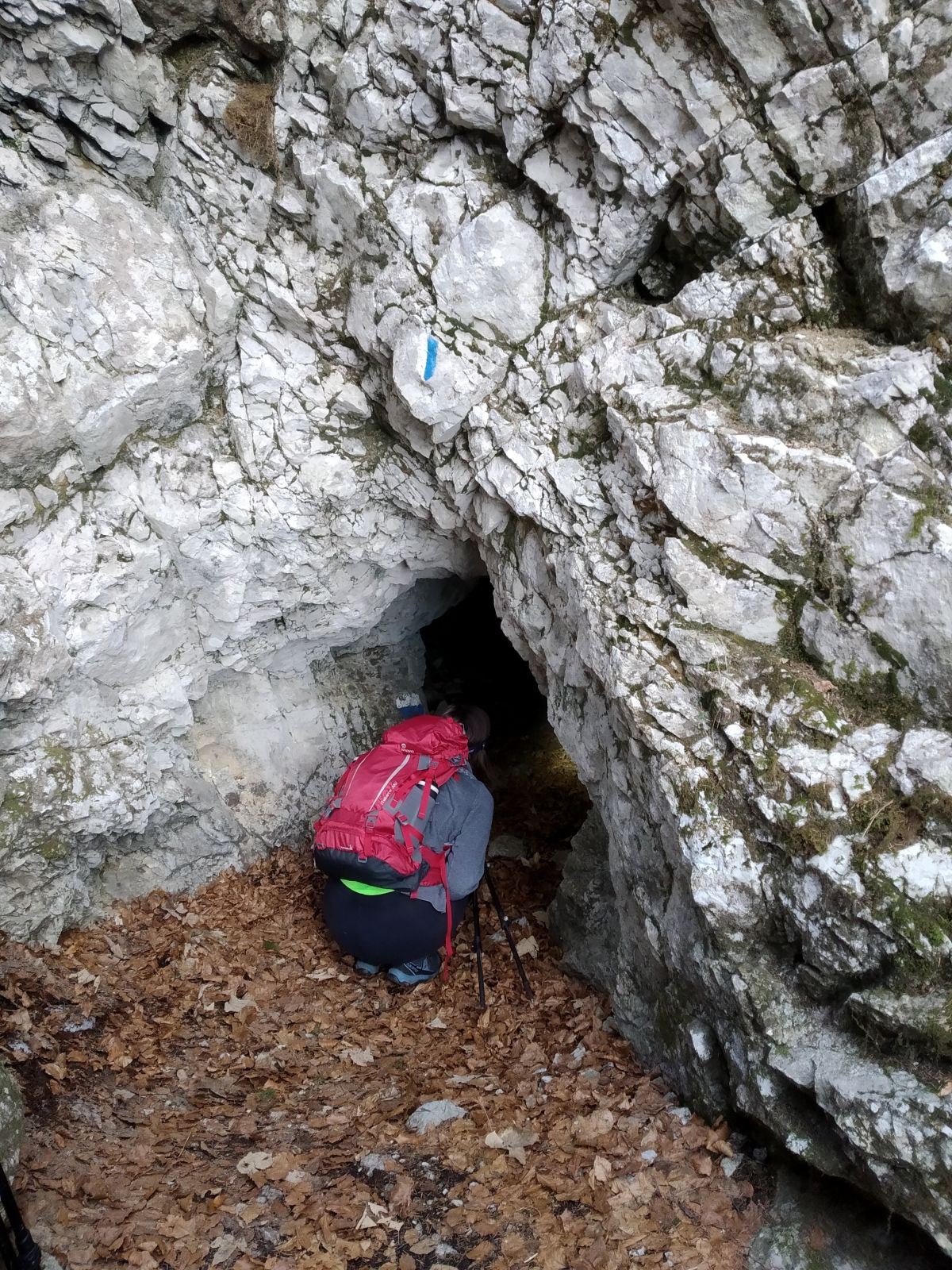 Giriamo a destra e seguiamo le trincee ed i camminamenti utilizzati dai soldati durante la Prima Guerra Mondiale. Attraversiamo una piccola e bassa grotta e saliamo la scalinata interna. Dopo pochi minuti raggiungiamo la Croce dell'Osservatorio (1690mt), un bel balcone panoramico dove poter ammirare il sottostante lago.