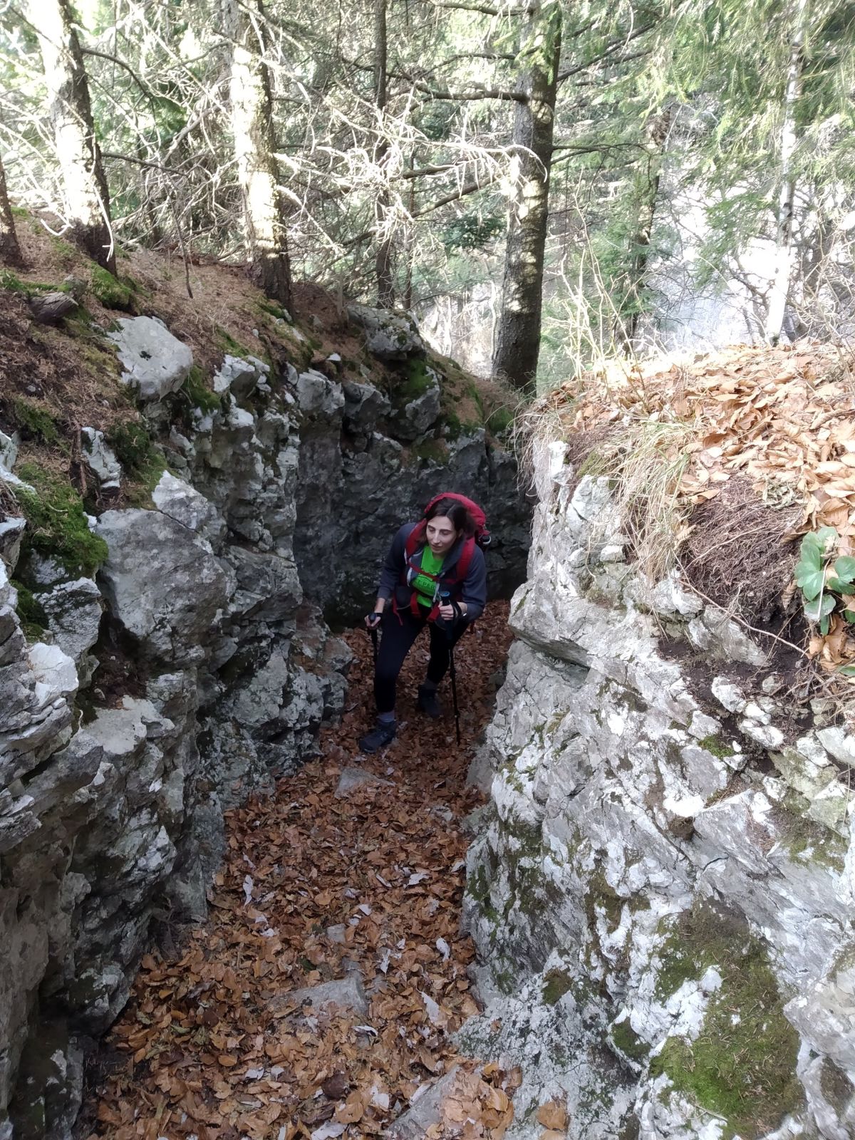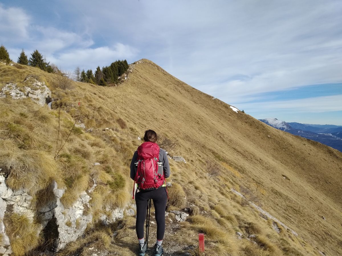 Il sentiero continua ad incrociare la sterrata appena abbandonata e ci consente di guadagnare quota più velocemente. Dopo aver attraversato per la terza volta la sterrata, si presenta un breve e semplice risalto quasi verticale attrezzato con un vecchio cavo metallico. Poco dopo aver superato questo tratto la traccia incrocia il sentiero austroungarico (1425mt) che ci condurrà fino in vetta.