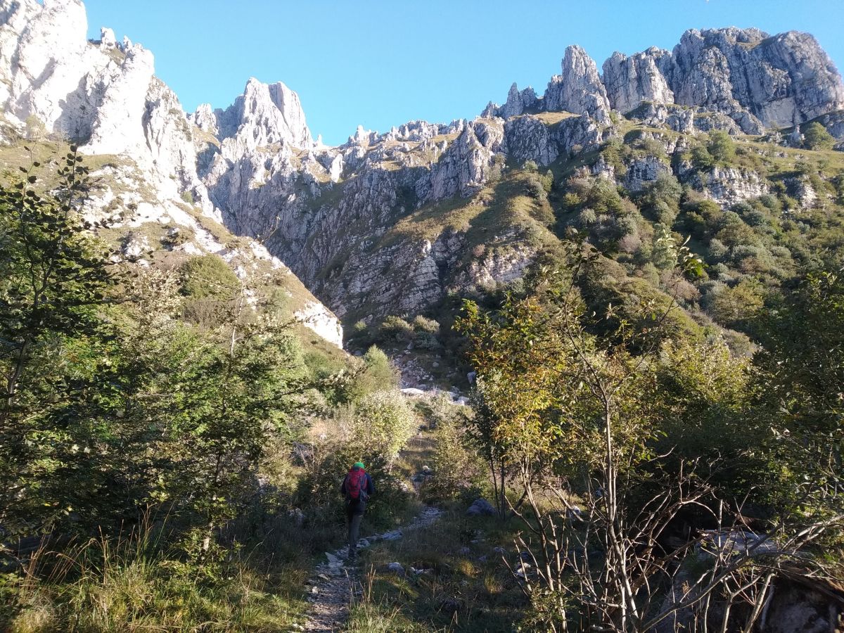 La pendenza finalmente aumenta e ci permette di guadagnare quota velocemente passando al fianco dei rocciosi torrioni con alcune vie d'arrampicata.