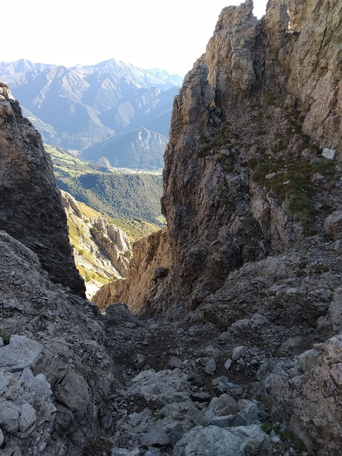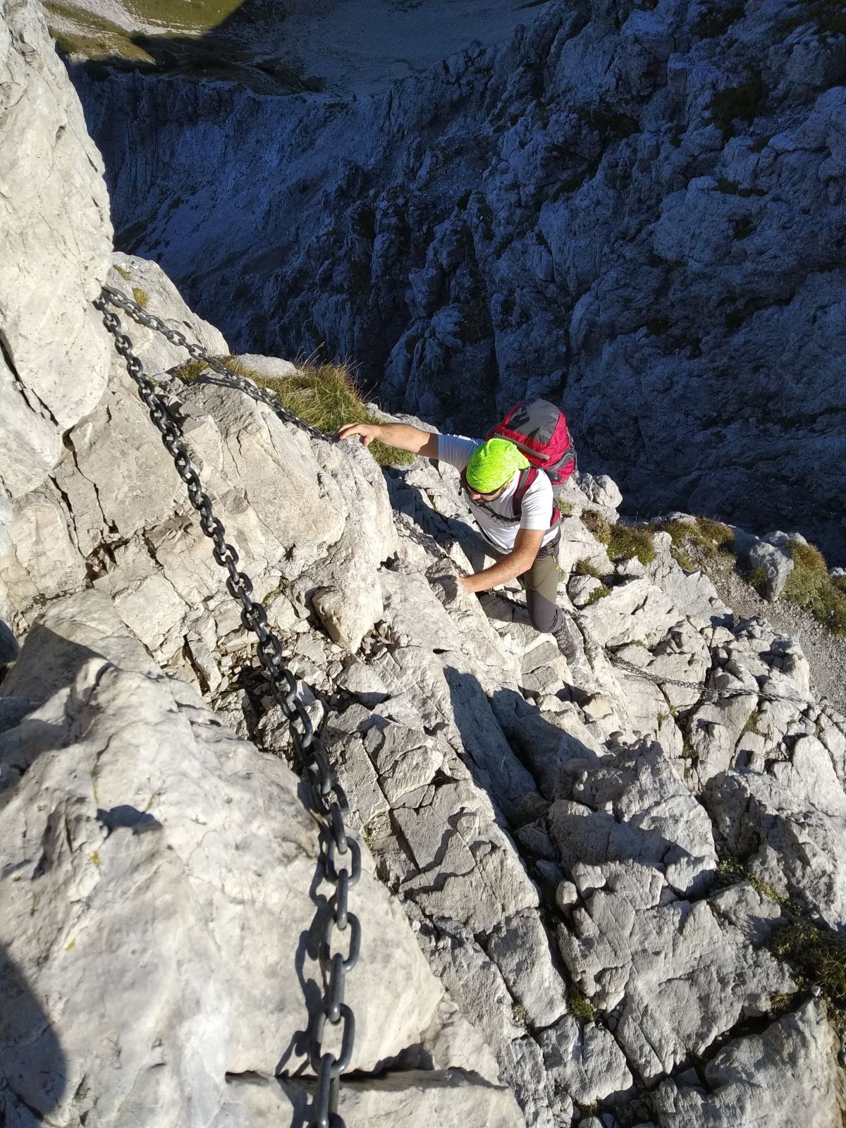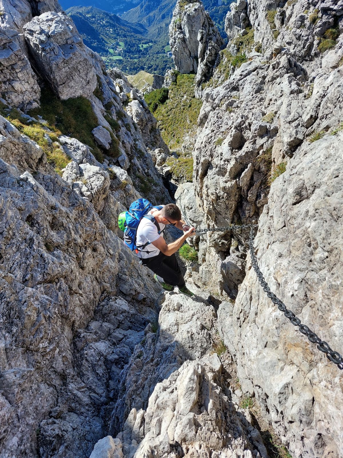 Affrontiamo un breve e semplice tratto attrezzato con una catena, poi scendiamo lungo un canalino ancora attrezzato ed infine superiamo l'ultimo tratto più verticale sempre con l'aiuto delle catene fino a raggiungere la cima.