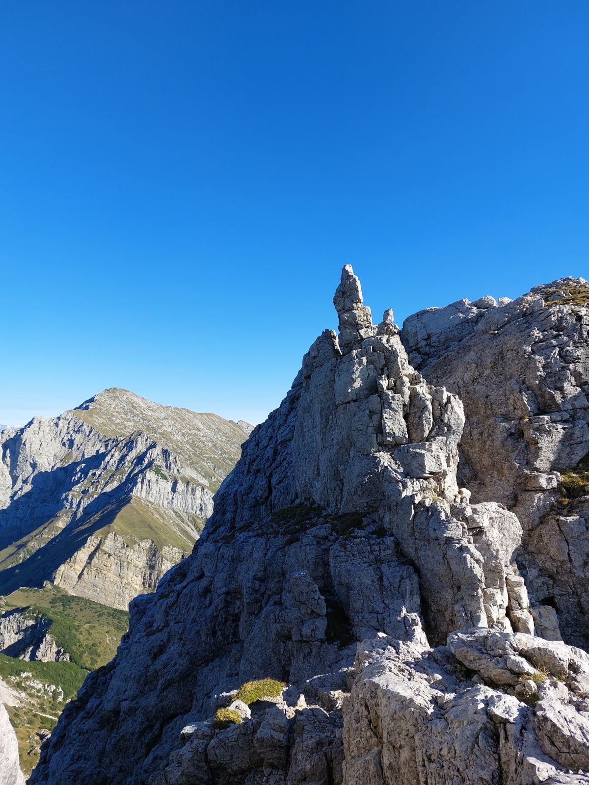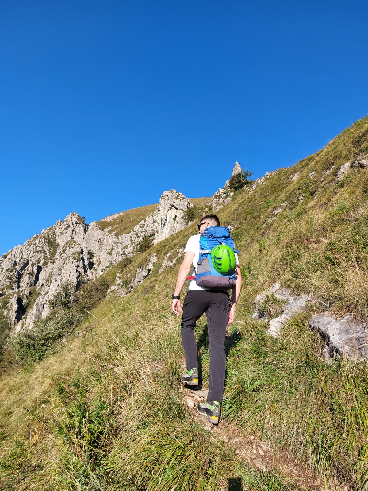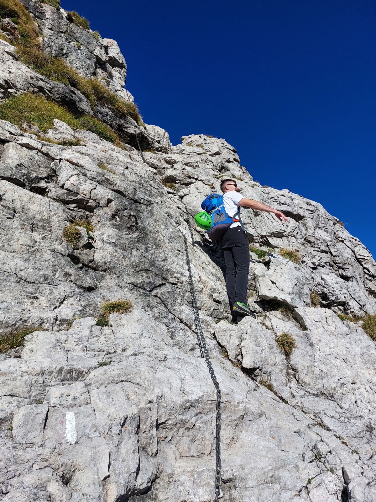 Affrontiamo un breve e semplice tratto attrezzato con una catena, poi scendiamo lungo un canalino ancora attrezzato ed infine superiamo l'ultimo tratto più verticale sempre con l'aiuto delle catene fino a raggiungere la cima.