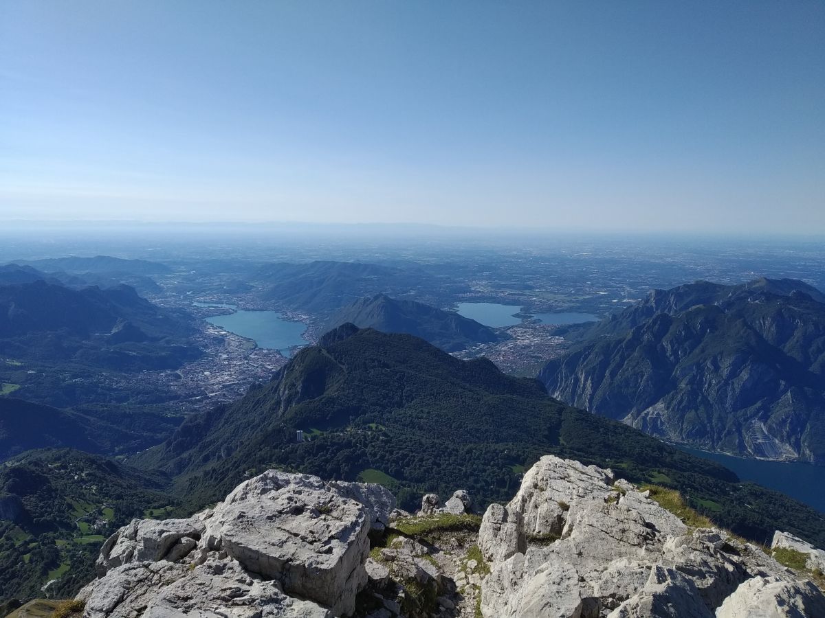 Grazie alla splendida giornata il panorama dalla cima è grandioso, a nord tutte le vette imbiancate e la vicina Grigna settentrionale, a ovest l'imponente gruppo del Rosa e sotto di noi il ramo del lago di Lecco.