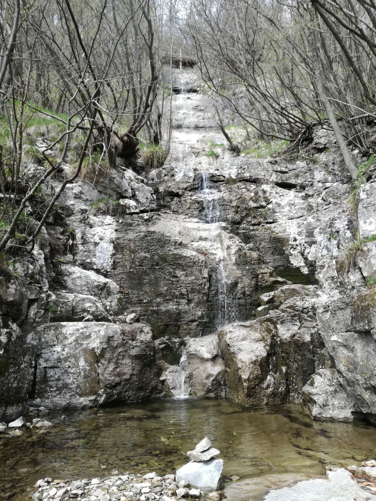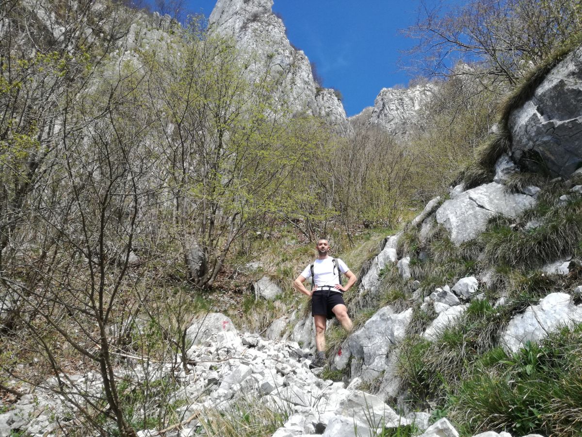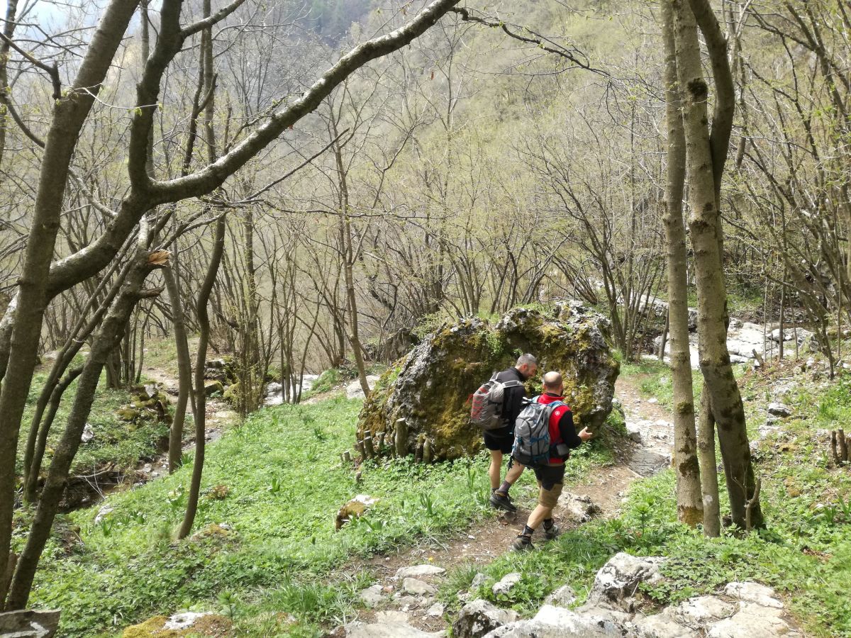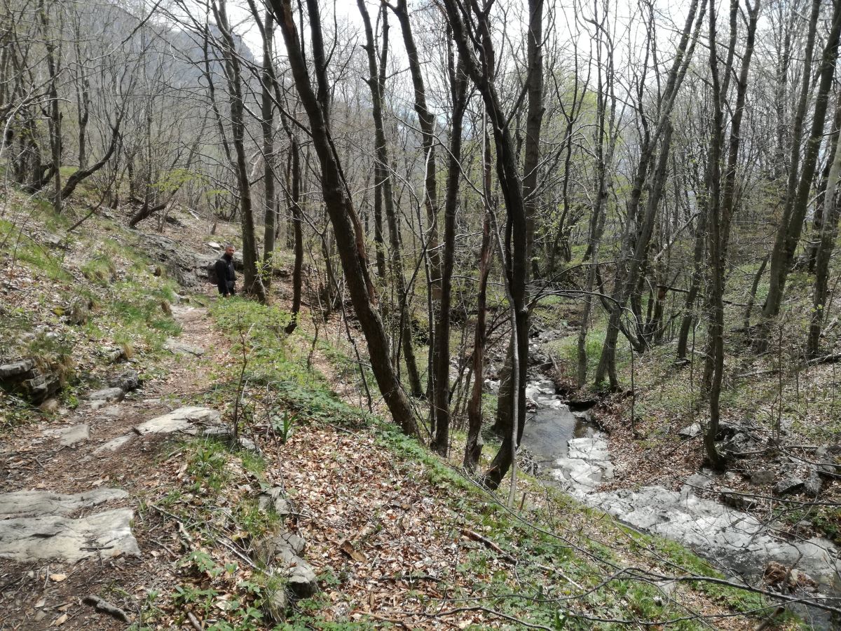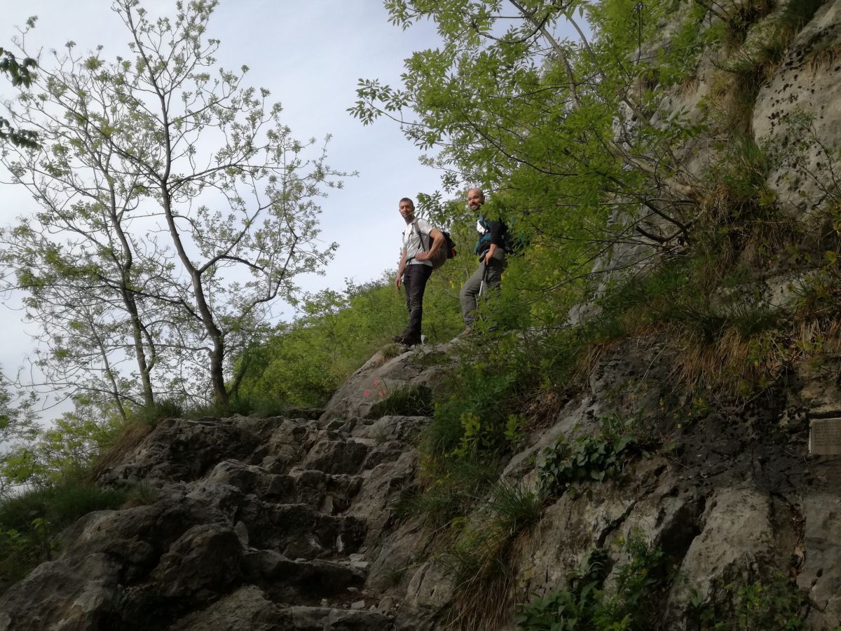 La mulattiera, poi sentiero, in mezzo al bosco si dirige verso ovest, lasciando alla nostra destra l'imponente parete del Corno Medale. Giunti a un bivio, pieghiamo decisamente a nord sul sentiero di ritorno della ferrata Gruppo Alpini. In circa 1 ora mezza, con traccia che sale decisa tra bosco e roccette, giungiamo appunto sul Corno Medale (1029mt), prima vetta del nostro itinerario.