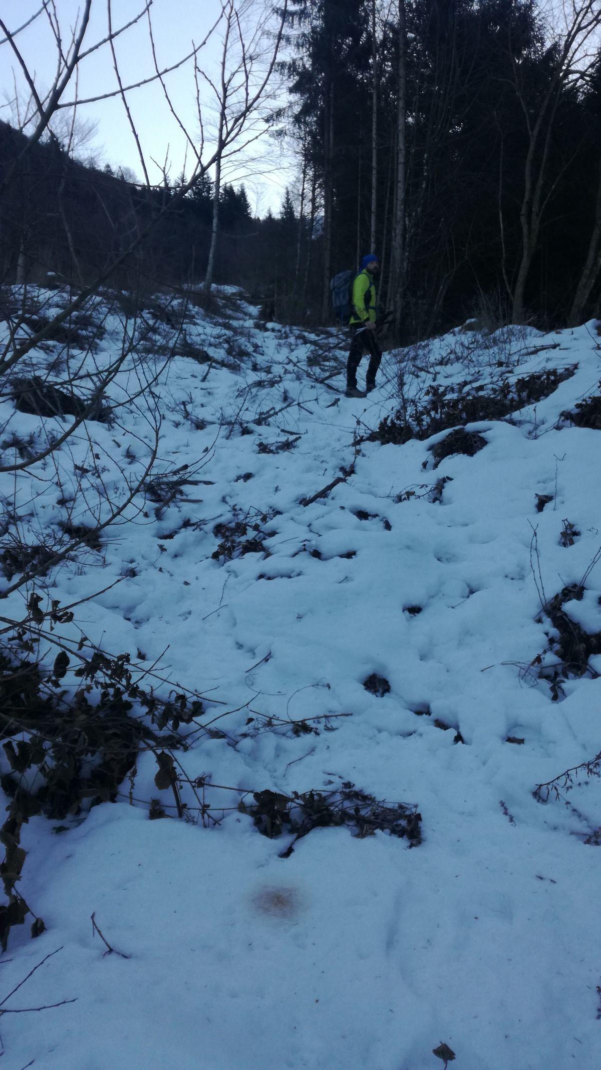 Procediamo lenti: la mulattiera è ricoperta di ghiaccio e siamo costretti ad andare fuori dal sentiero in mezzo alla vegetazione.