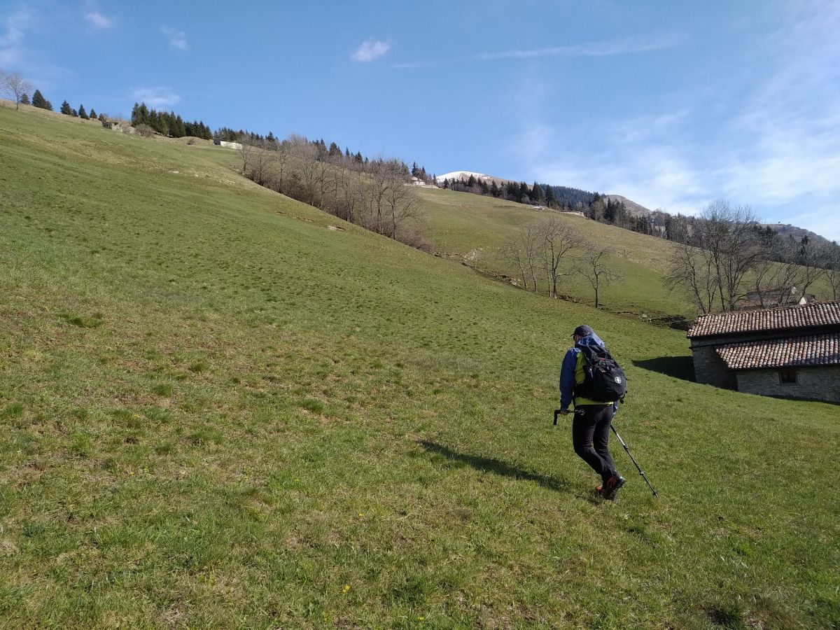 Tagliamo ora per prati senza segnalazioni precise, evitando la strada asfaltata che incrociamo più sopra e ne percorriamo un tratto fino alle due baite (bassa e alta) nei pressi del Rifugio Vaccaro (1519mt, 1,45h).
