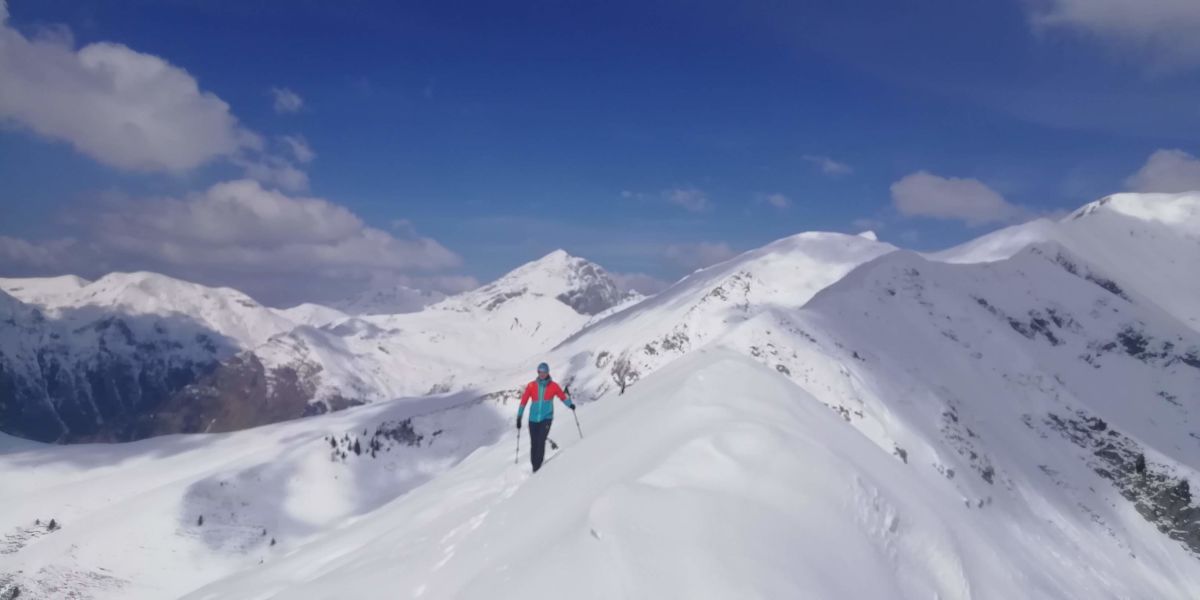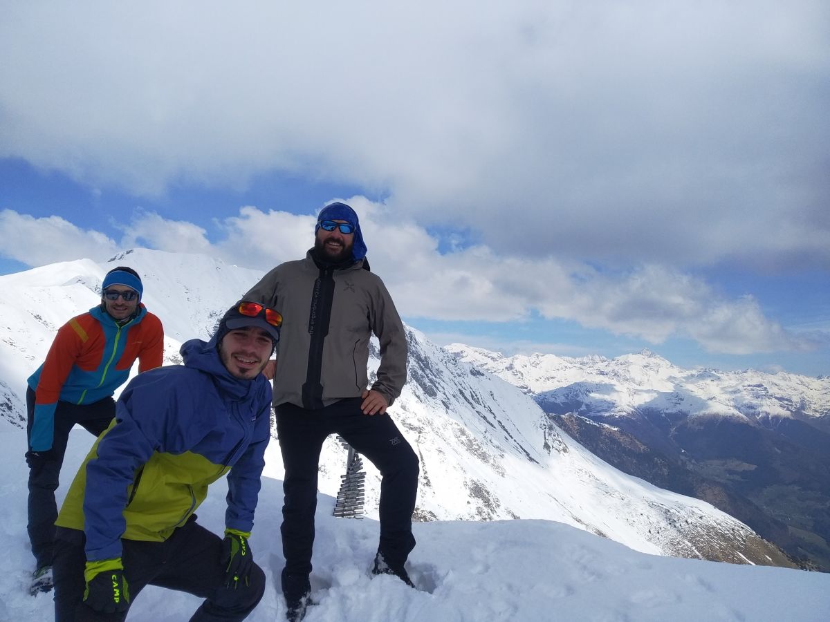 Ci lasciamo il rifugio sulla sinistra e iniziamo la vera salita, nella neve ben assestata, seguendo alcune tracce. Raggiungiamo la cresta nei pressi di un colletto con palo segnaletico e proseguendo a sinistra risaliamo la dorsale fino alla vetta (3.00h dalla macchina con buon passo).