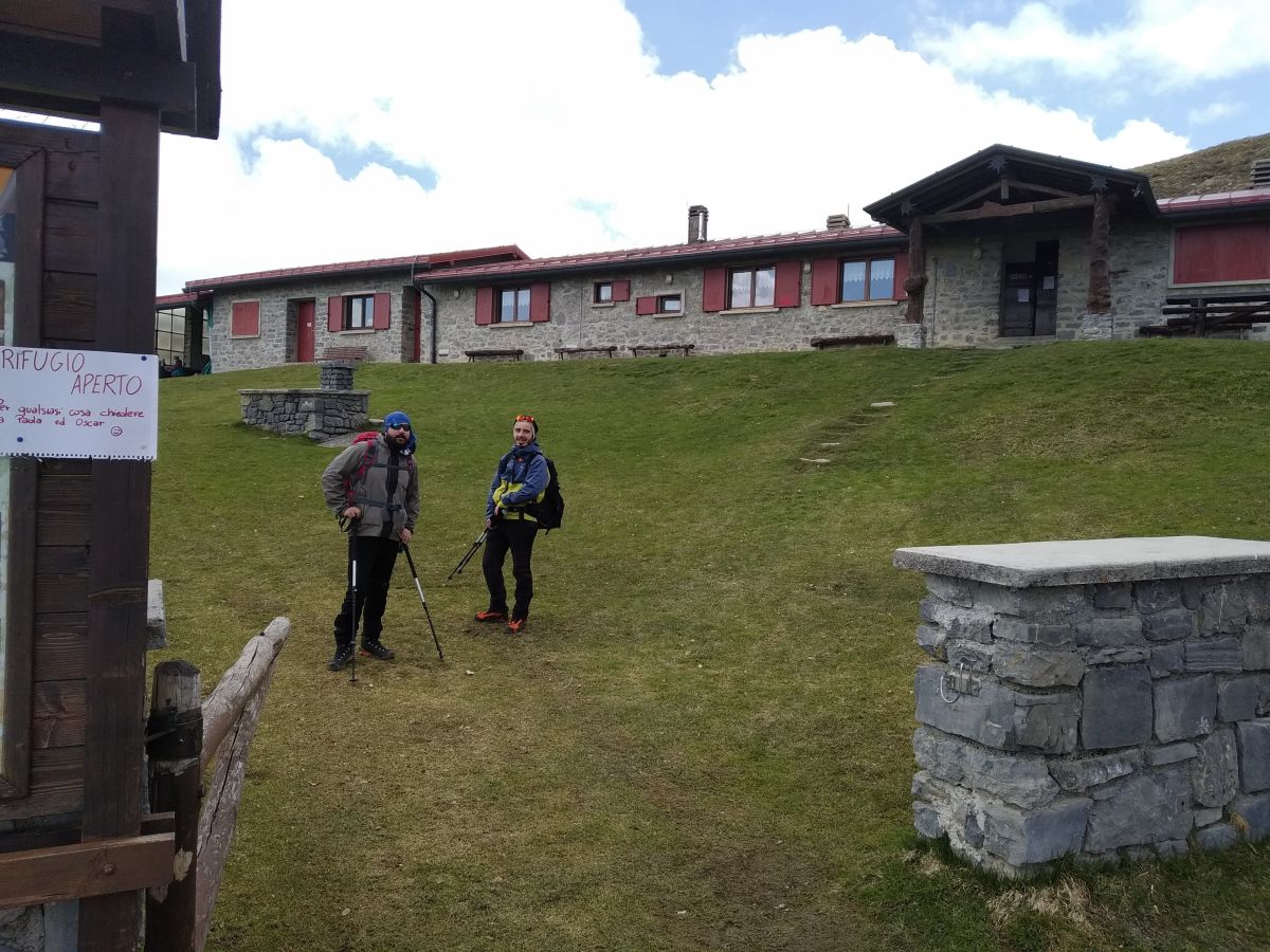 Ci godiamo il fantastico panorama sulle Orobie imbiancate: Alben, Arera e Presolana su tutte e poi scendiamo all'ottimo Rifugio Vaccaro, gestito da volontari eccezionali: una gradita sosta!