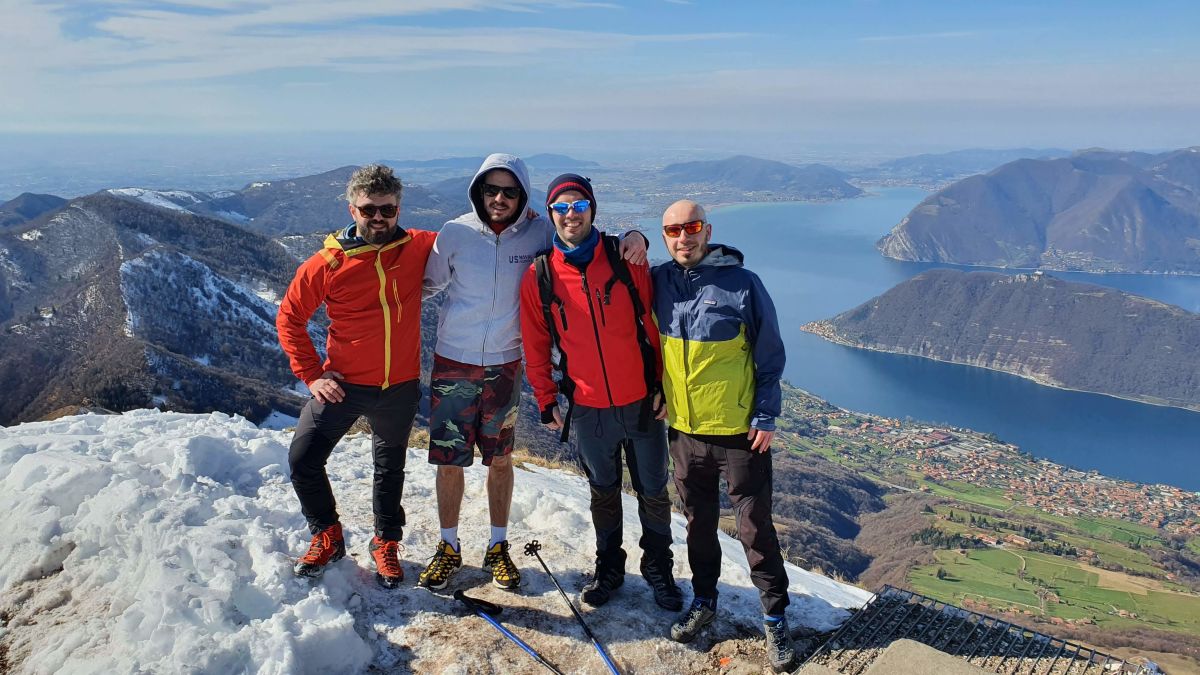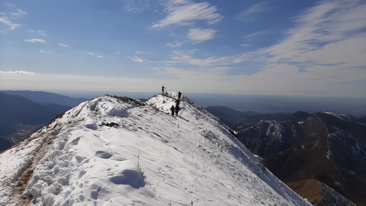 Ci aspetta ora il tratto finale: seguendo le indicazioni per EE, risaliamo il costone tra roccette e rada vegetazione fino a sbucare sulla cresta innevata. In 5 minuti siamo alla grande croce di vetta.