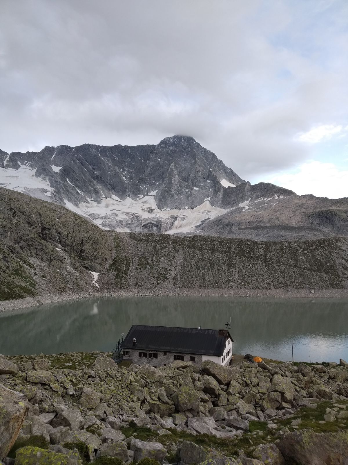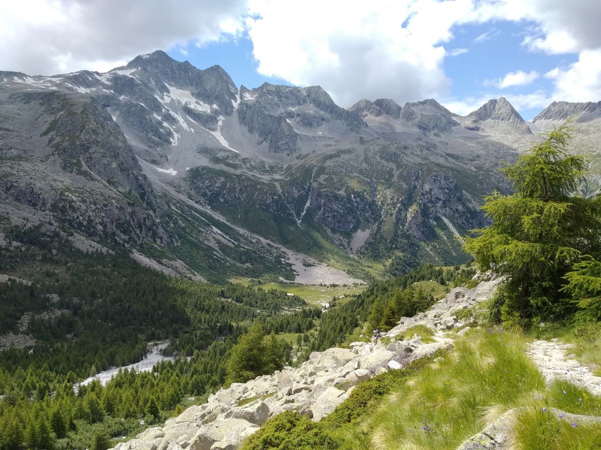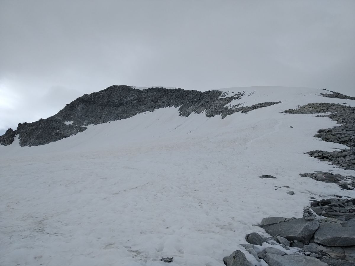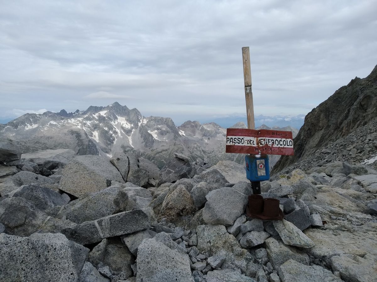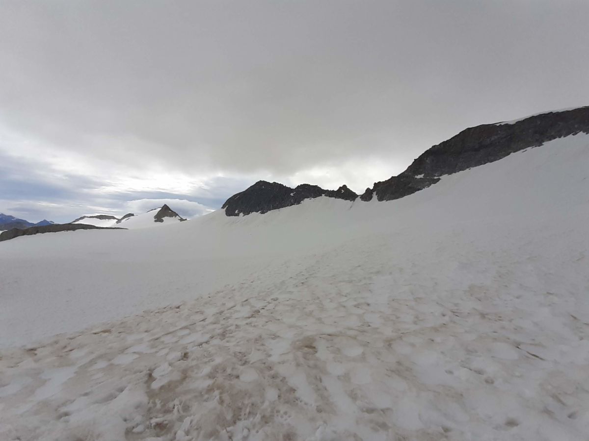 Seguiamo il segnavia che poco prima del rifugio indica il Passo del Venerocolo. Il sentiero è tutto su roccia e sempre ben segnato: la prima parte, circa 40 minuti, è camminabile; mentre la seconda parte risulta più scomoda, su grandi massi e con presenza di neve. Arriviamo ai 3136mt del passo in 1.45h. Davanti a noi si estende il fantastico panorama sulla Vedretta del Pisgana.