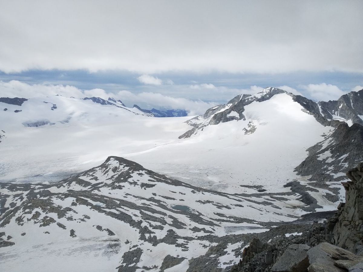Anche se il cielo è un po' coperto, godiamo della magnifica vista sul ghiacciaio dell'Adamello, e sulle cime del circostanti.