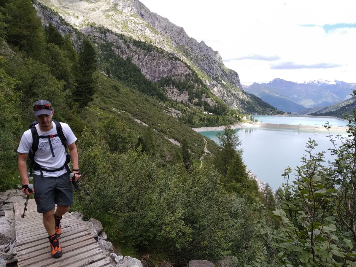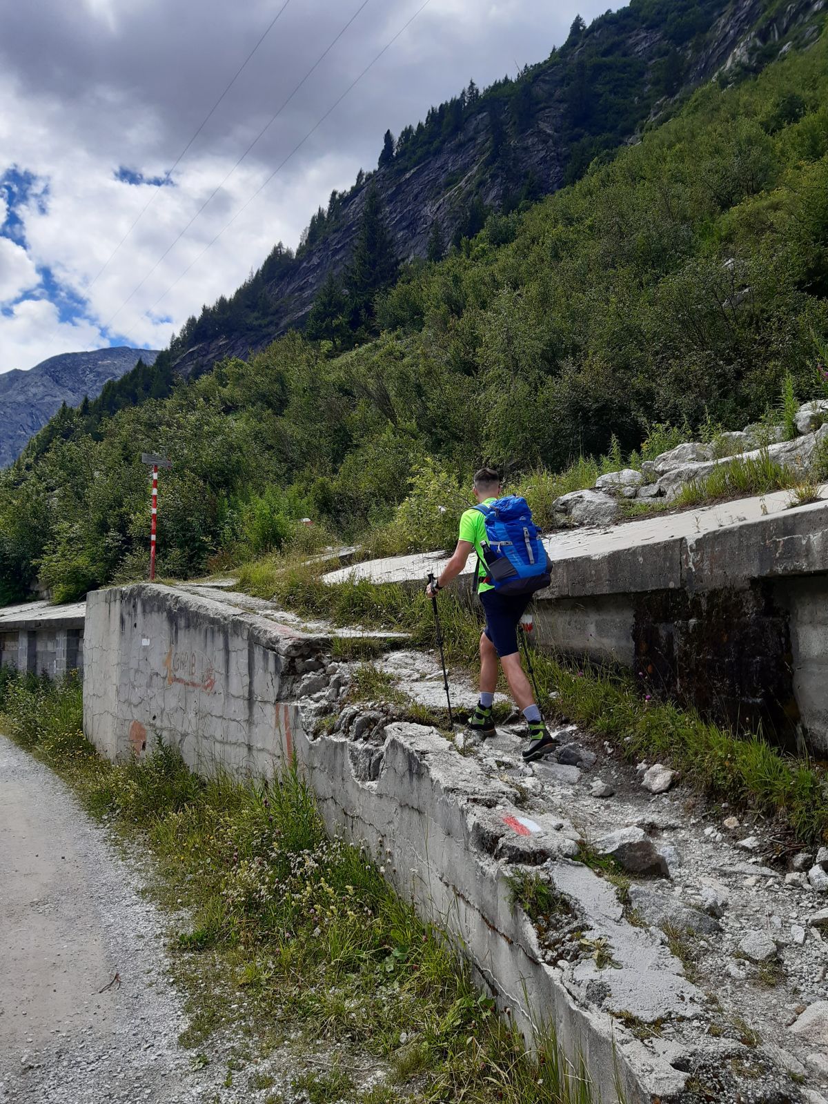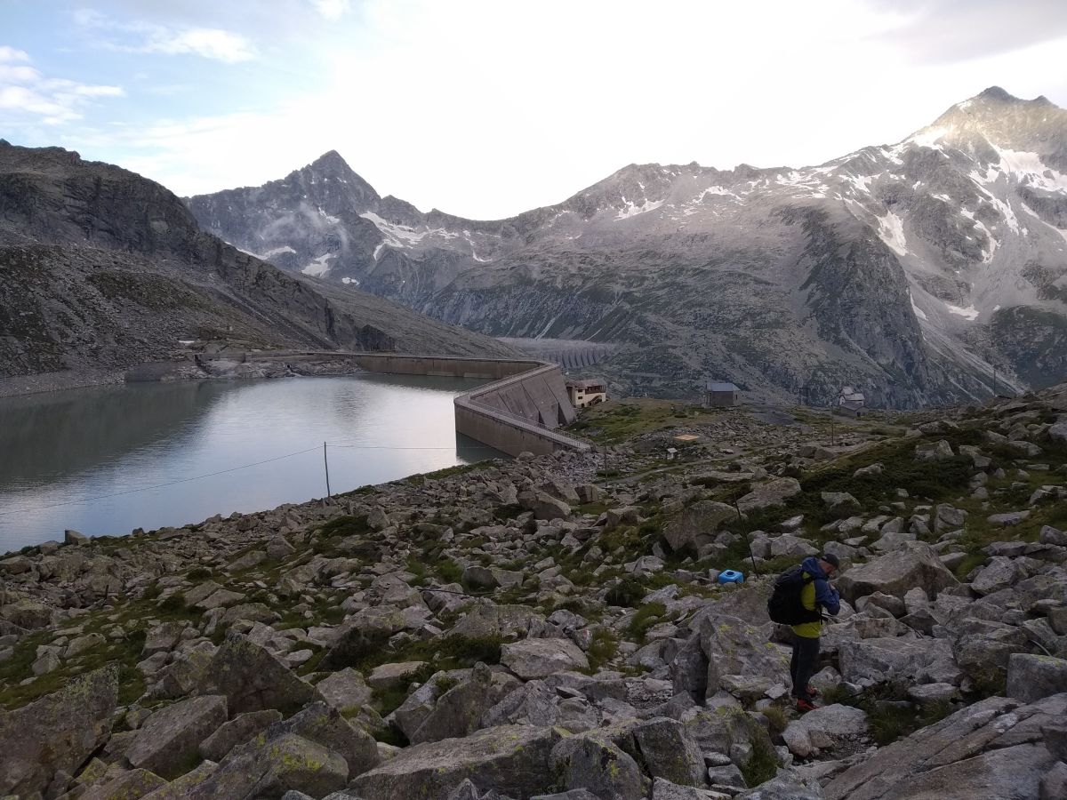 Zaino in spalla, proseguiamo sulla strada che poco più avanti diventa asfaltata e molto ripida, fino a raggiungere gli edifici delle dighe.
