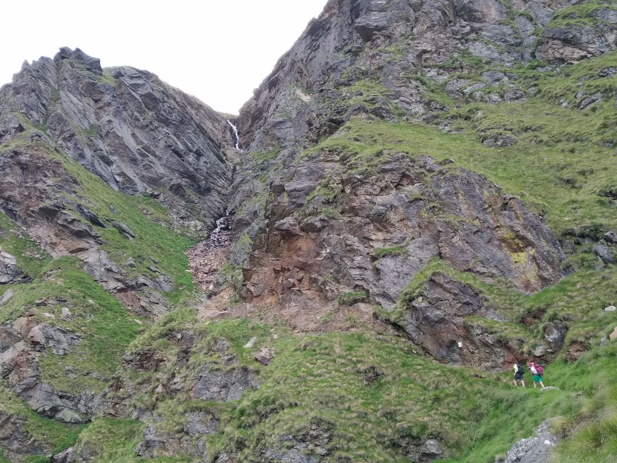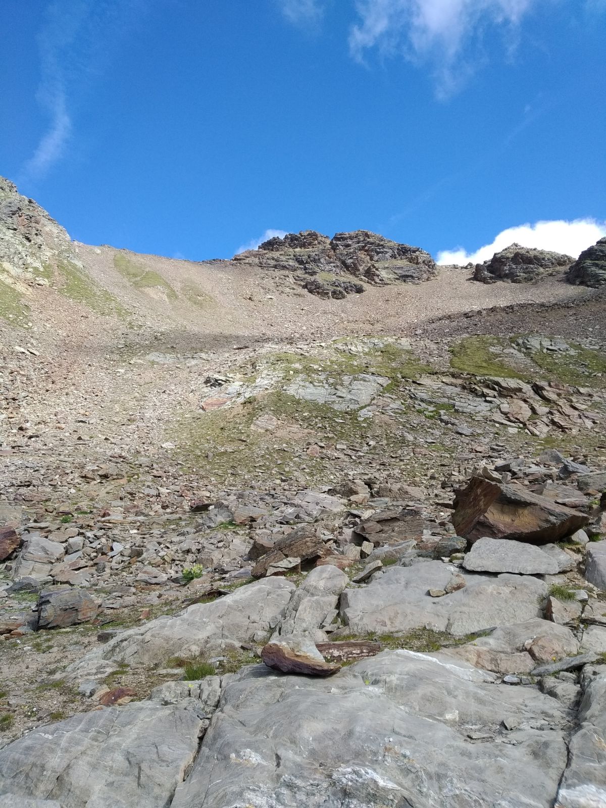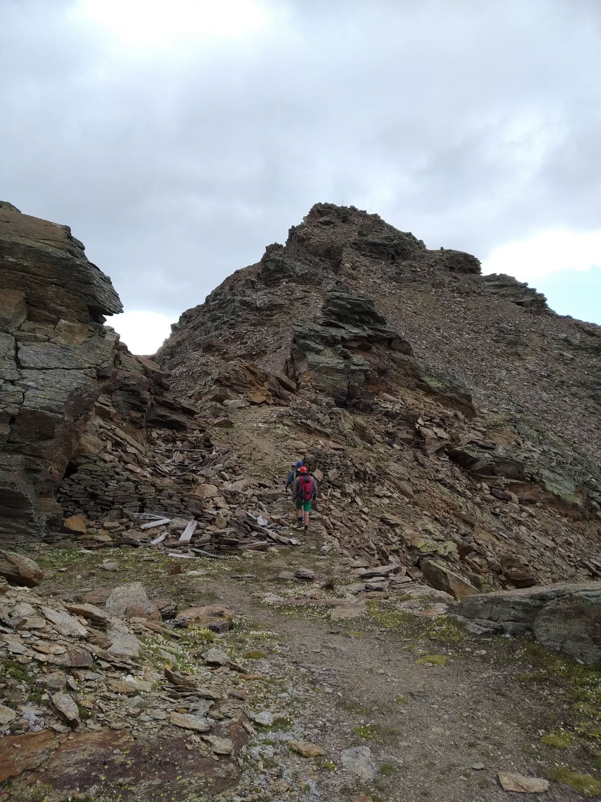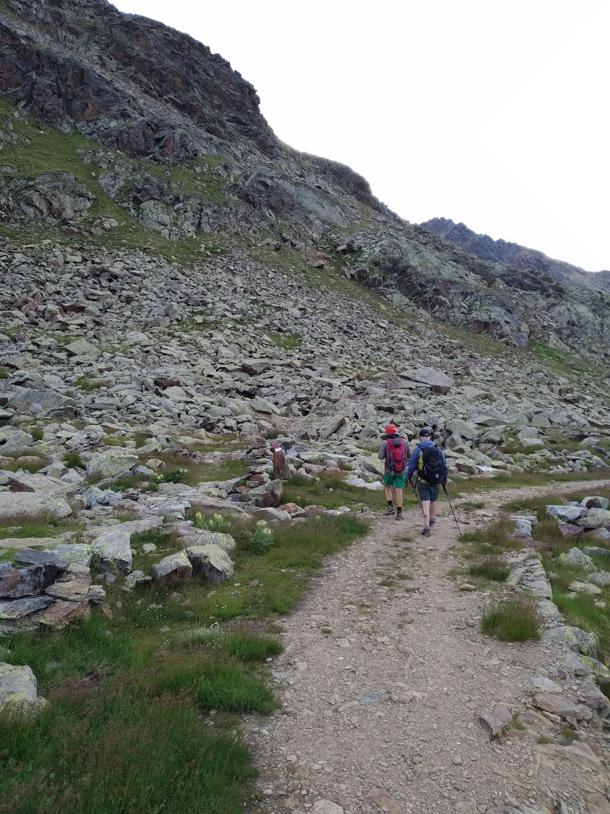 Poco prima dei laghi, seguiamo le indicazioni per il Rifugio Bozzi ma abbandoniamo presto il sentiero principale e iniziamo a salire su rocce e sfasciumi. Attenzione: non ci sono cartelli ma solo dei segni bianco-rossi a terra sulla sinistra.