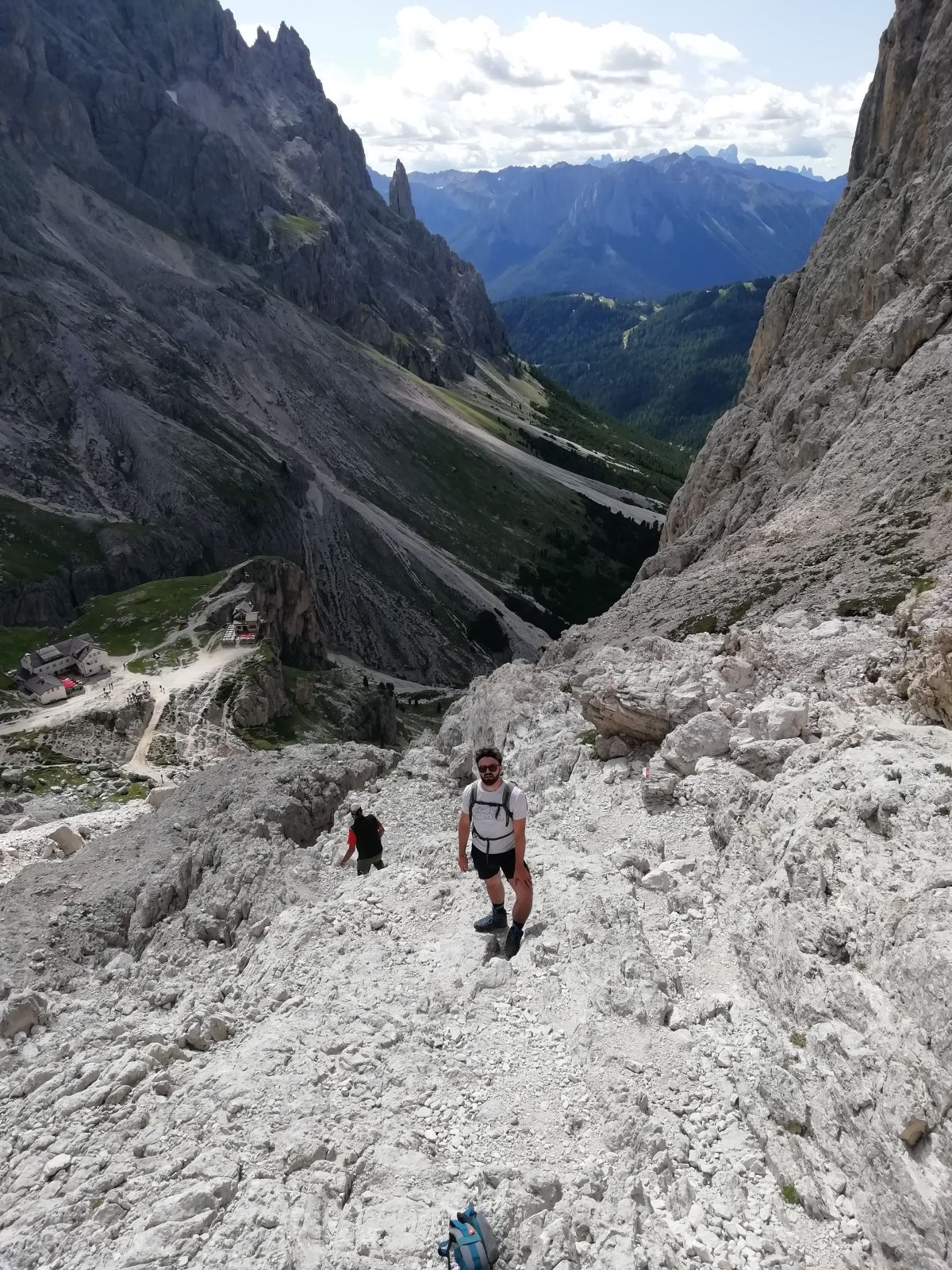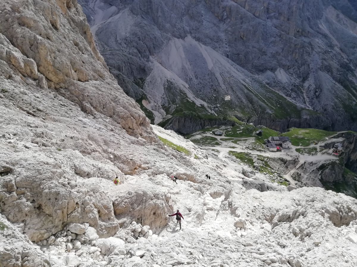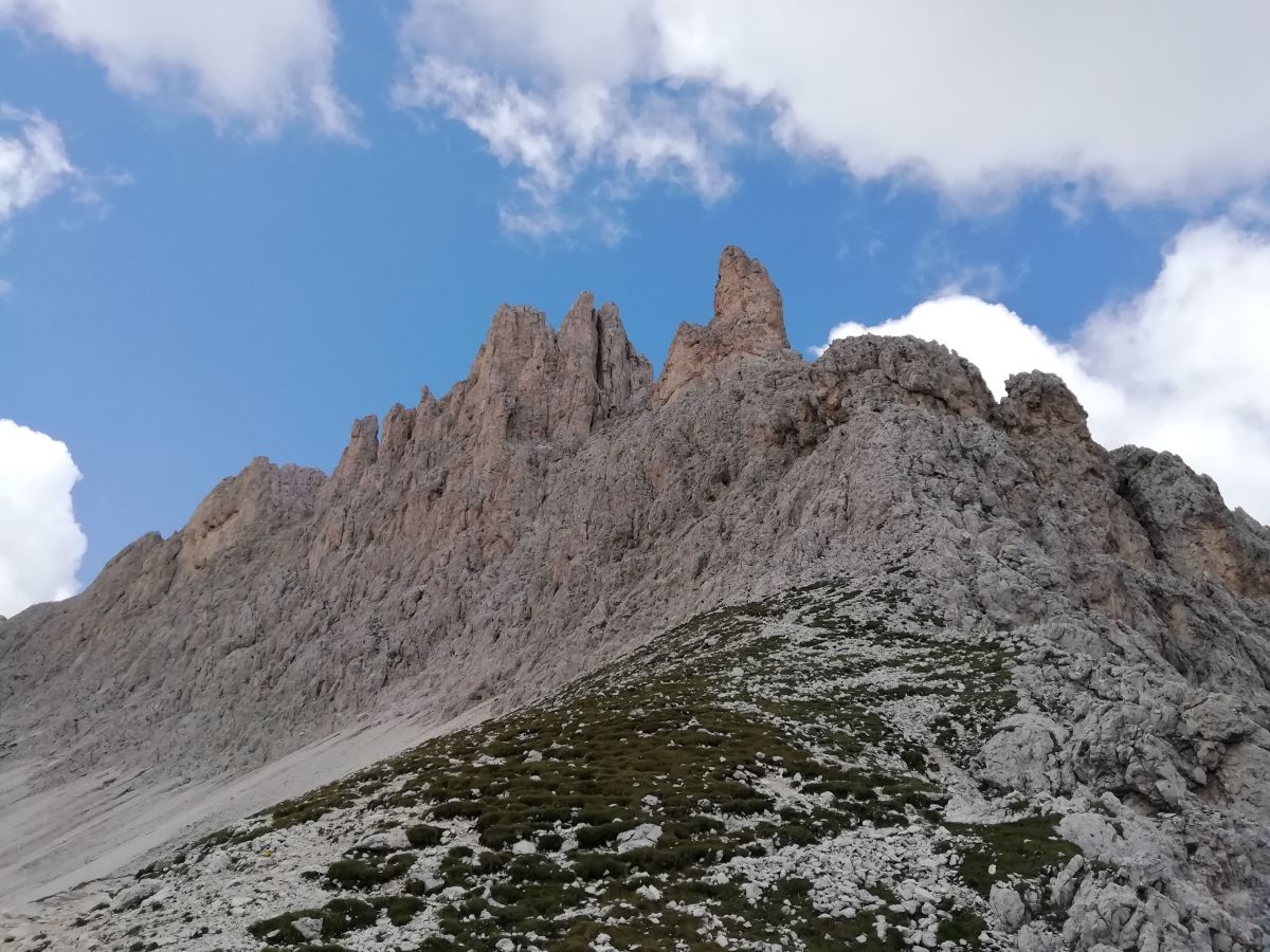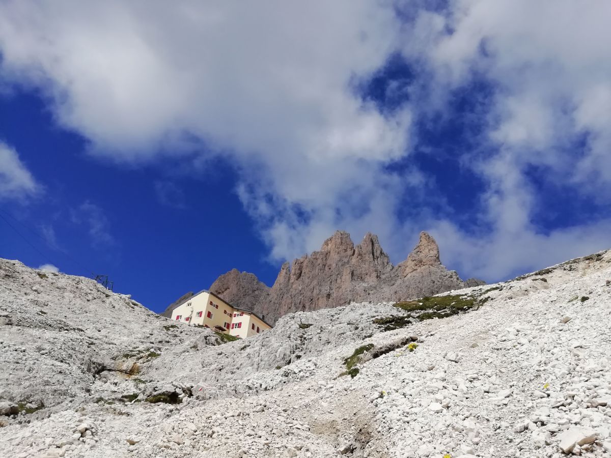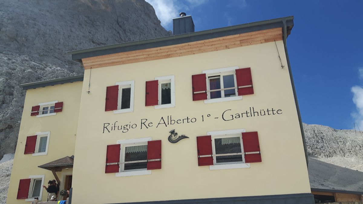 Superato questo ripido tratto, entriamo nella Conca del Gartl, dove si trova il Rifugio Re Alberto I (1.00 ora dal Rifugio Vajolet). Di fronte a noi si stagliano le magnifiche Torri del Vajolet, e noi rimaniamo estasiati nel vedere le numerose cordate di scalatori in azione sulle sue pareti strapiombanti.
