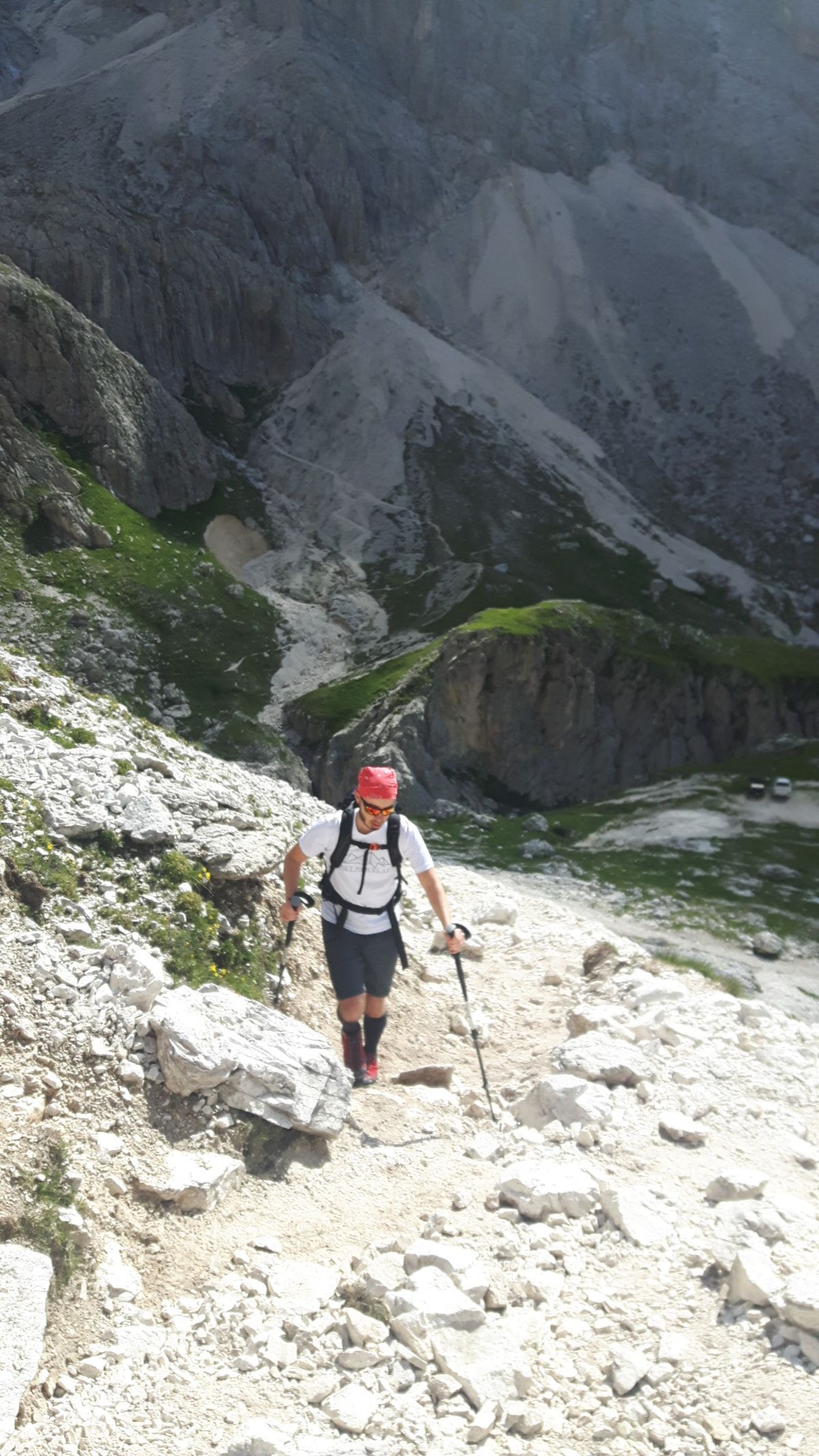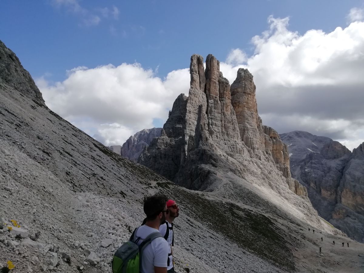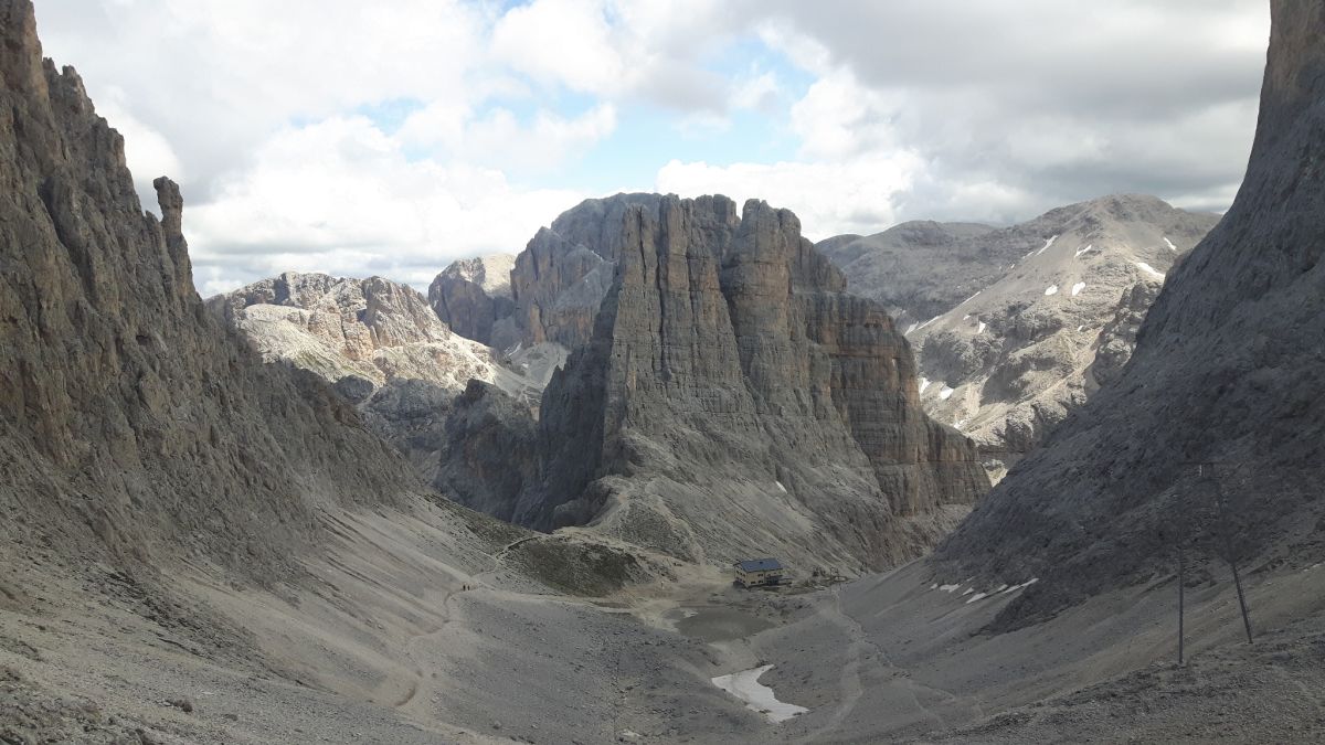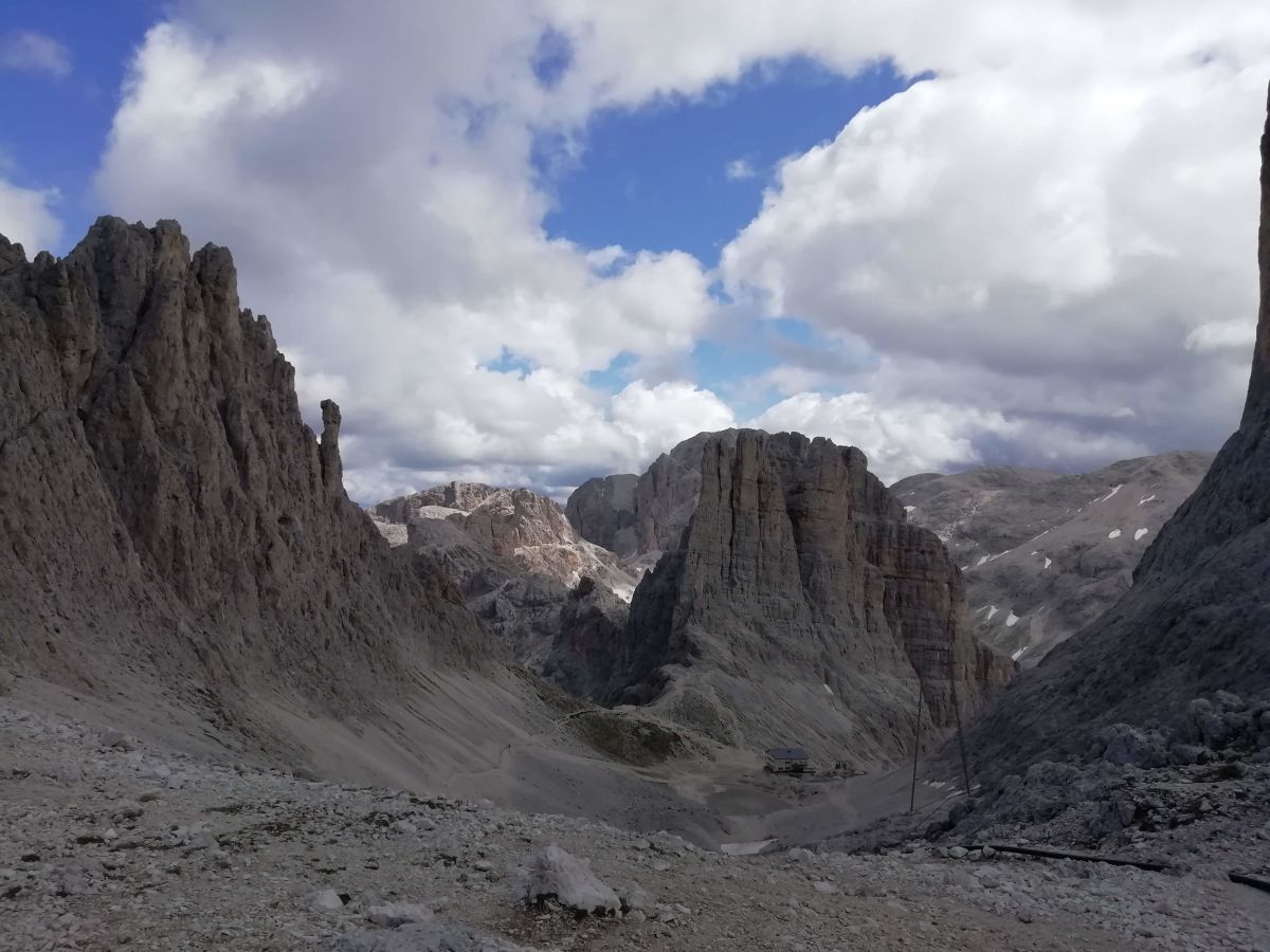 Superato questo ripido tratto, entriamo nella Conca del Gartl, dove si trova il Rifugio Re Alberto I (1.00 ora dal Rifugio Vajolet). Di fronte a noi si stagliano le magnifiche Torri del Vajolet, e noi rimaniamo estasiati nel vedere le numerose cordate di scalatori in azione sulle sue pareti strapiombanti.