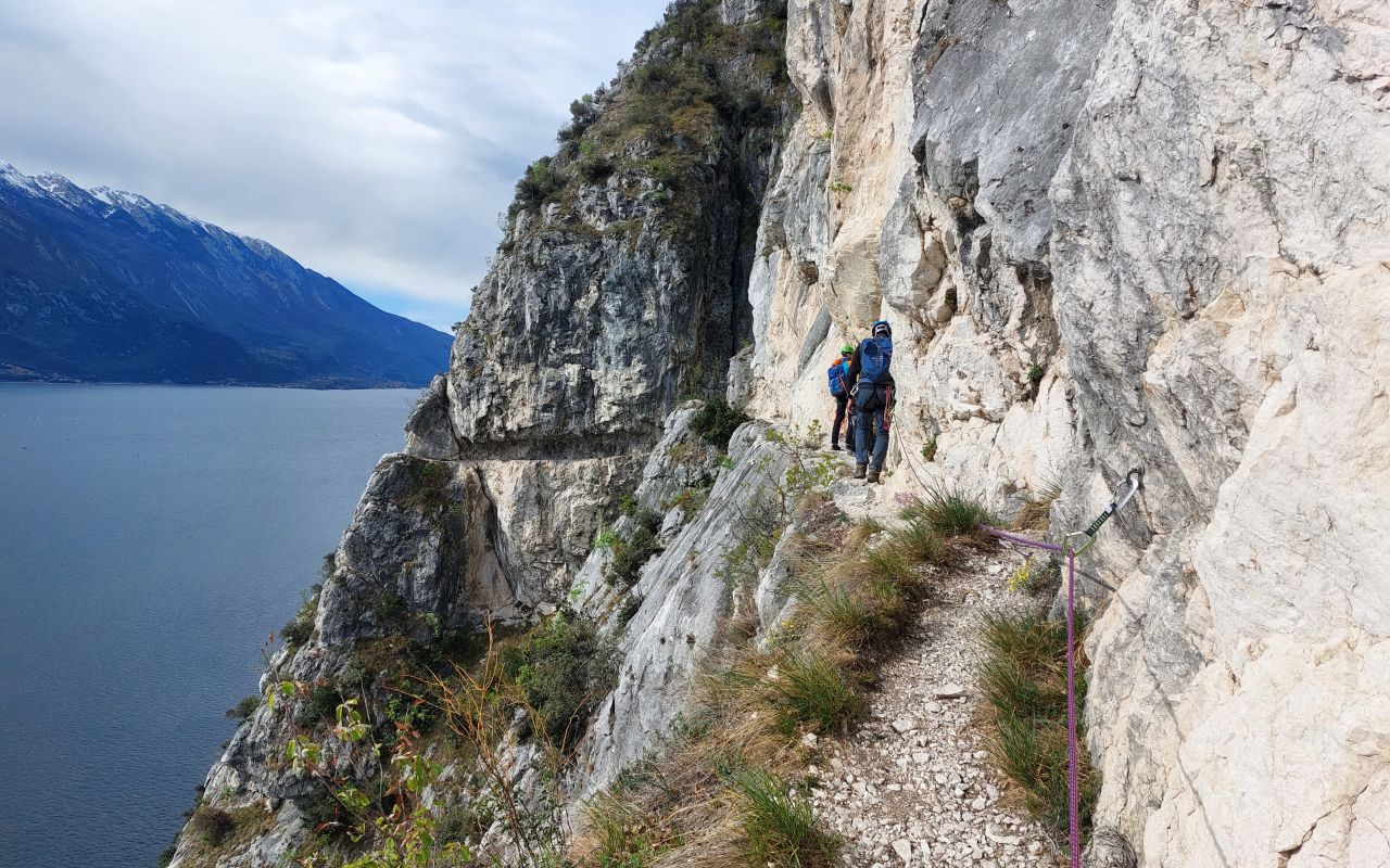 Il sentiero non è difficile, non ci sono tratti di arrampicata in verticale, ma va affrontato con la giusta conoscenza di progressione in conserva simultanea e la giusta attrezzatura. Lo ripetiamo: non è una ferrata. É sufficiente una corda da 30 metri e 10/12 rinvii. Il sentiero è percorso anche nel senso inverso, quindi attenzione quando si incrociano alpinisti. Noi in 2 cordate abbiamo impiegato circa 3.00h per il solo sentiero alpinistico: il consiglio è di procedere con calma per godersi il fantastico panorama sul lago.