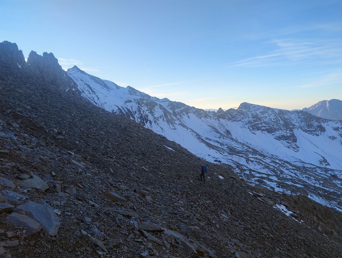 Dopo un breve spuntino, scendiamo per la stessa traccia della salita. Arrivati sul ghiaione, cerchiamo di perdere meno quota possibile e cominciamo a tagliare a sinistra per ricongiungerci col sentiero che ci condurrà verso la seconda vetta di giornata, il Pizzo Tre Confini. La pendenza ed un po' di neve ben rigelata ci costringe ad indossare i ramponi. Superato un tratto più pendete, passiamo nei pressi di un laghetto e puntiamo all'ampia cresta che ci porterà fino in vetta al Tre Confini (2824mt, 3.30h).