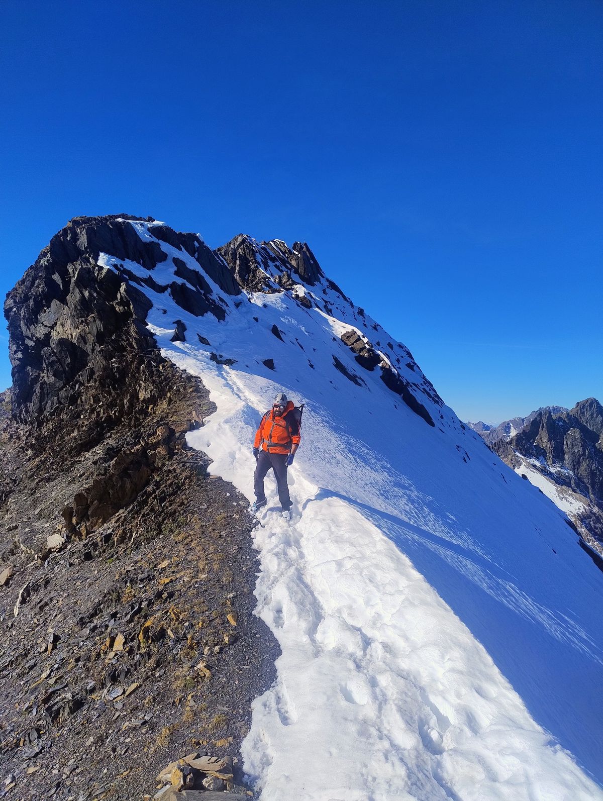 Tolti i ramponi, proseguiamo lungo la cresta che ci separa dalla terza cima, il Monte Gleno. Restiamo sul versante destro, sgombro dalla neve. Non ci sono segni evidenti ma la traccia è intuitiva e non presenta difficoltà tecniche. Poco prima dell'ultimo tratto superiamo una decina di metri abbastanza esposti. Da qui non ci resta che arrampicare (I-II) gli ultimi più verticali metri che ci separano dalla croce di vetta (2883mt, 4.15h).