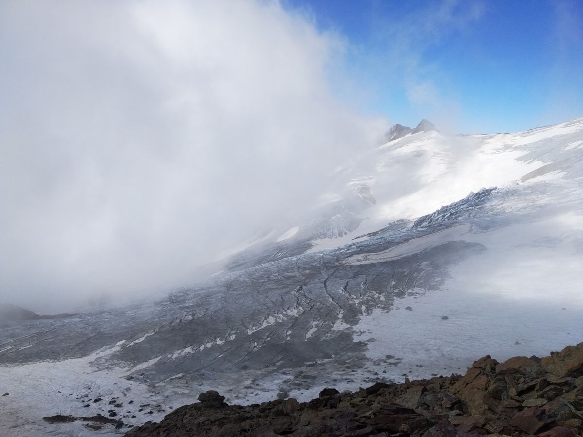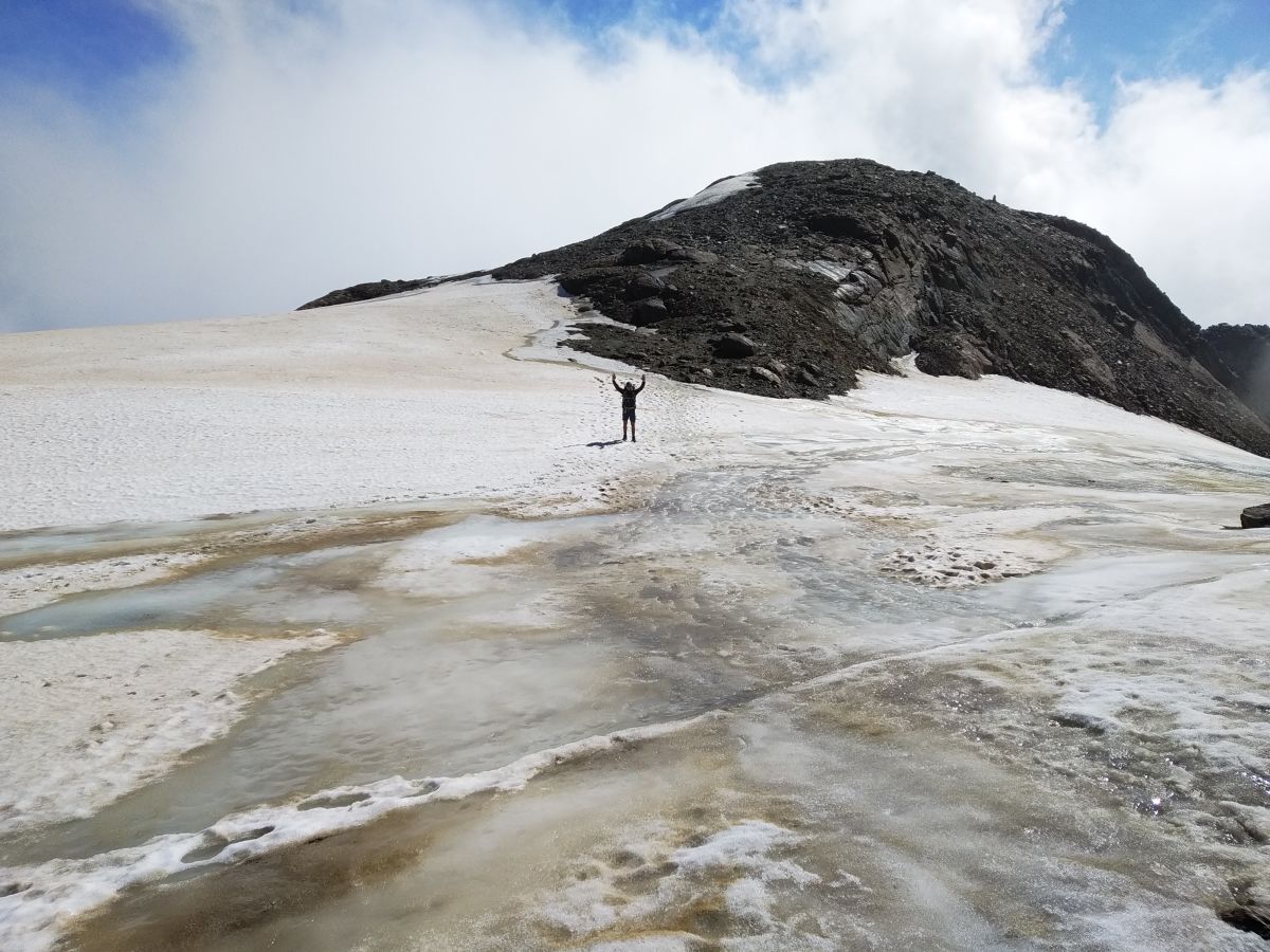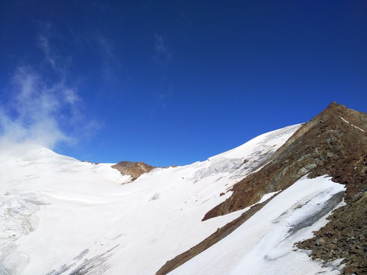 Raggiungiamo una sella ghiacciata dove la Vedretta della Forcola incontra quella che scende a sud del Cevedale. Attraversato questo tratto in piano (ramponi non necessari), percorriamo gli ultimi 200mt a cui prestare la massima attenzione per la fatica della lunga salita, la quota elevata (oltre i 3500mt) e soprattutto la presenza di alcuni passaggi delicati su placconate rocciose e pareti a picco su entrambi i lati. Finalmente arriviamo alla rocciosa e stretta cima dove è presente una piccola croce metallica (4.00h dal rifugio).