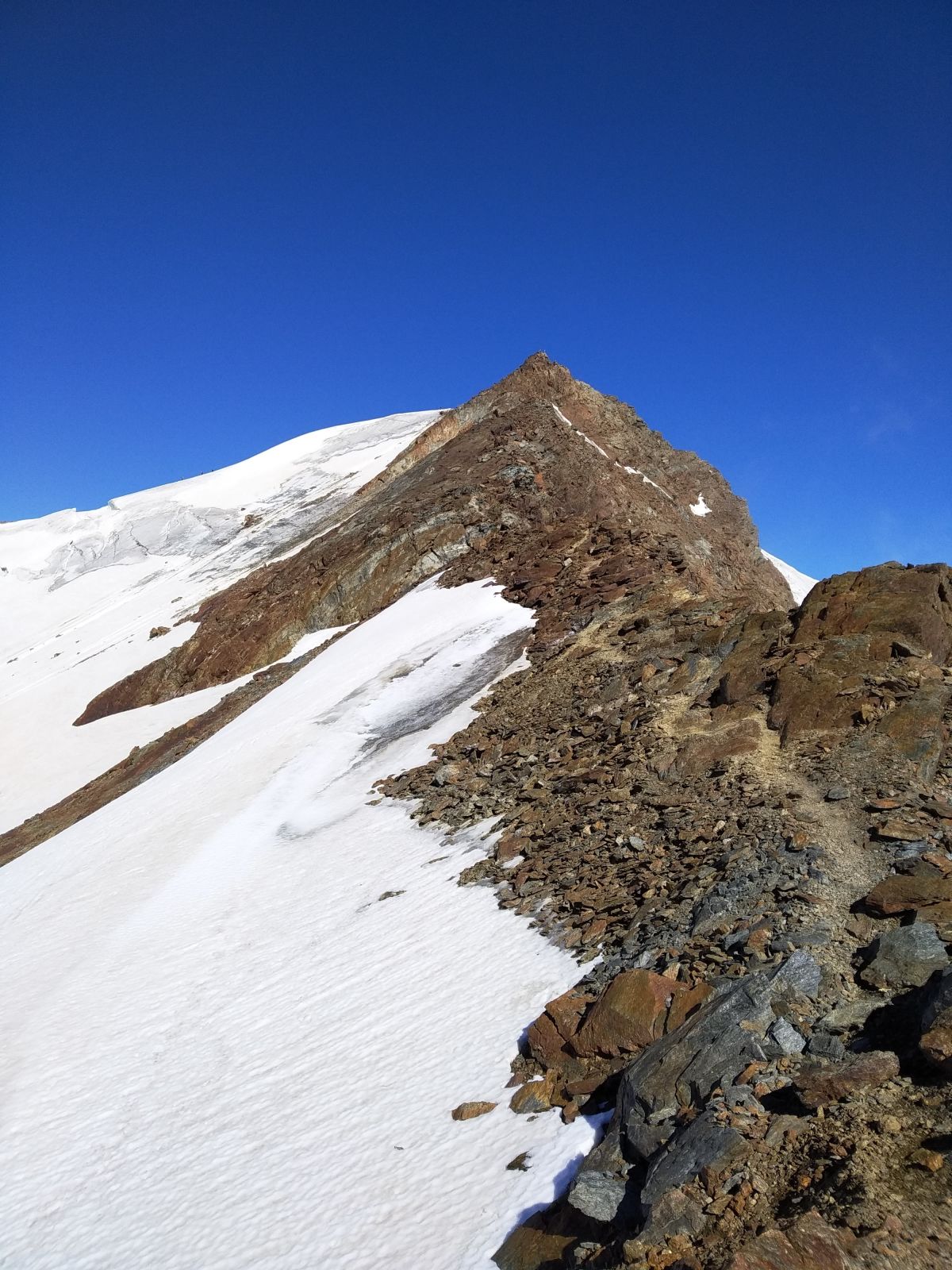 Dopo una breve pausa riprendiamo il nostro cammino salendo la cresta presente sulla nostra sinistra. Seguiamo gli ometti che ci guidano lungo la cresta larga e camminabile che si fa via via più stretta e ripida. In questo tratto ci uniamo ad altri escursionisti in cerca del tragitto migliore e, proseguiamo insieme tra roccioni e sfasciumi. Decidiamo di scendere una ventina di metri sulla neve, e poi ci riportiamo di nuovo sulla cresta.