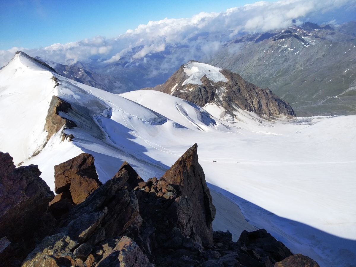 Il panorama dalla vetta è fantastico e ripaga tutta la fatica della salita: vette ed enormi ghiacciai oltre i 3000mt, la vicina cima del Cevedale con il ghiacciaio che risale dal Rifugio Casati, le imponenti vette del Gran Zebrú e dell'Ortles, le cime del Palon de la Mare e del Vioz.