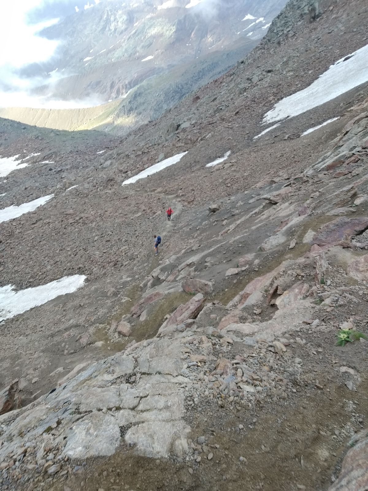 Lasciamo il rifugio verso le 6 del mattino seguendo il sentiero 103 in leggera discesa. Alla fine della valletta il sentiero risale, inizialmente con pendenze moderate e poi più ripidamente, puntando verso il Passo della Forcola (3032mt, 1.15h): qui è possibile ammirare la sottostante Vedretta della Forcola che scende verso la Val Martello.
